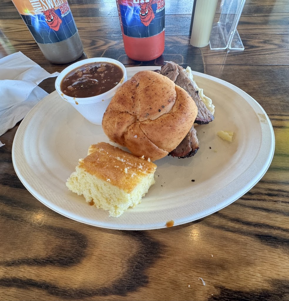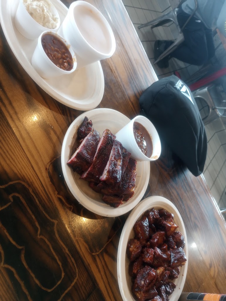 Good customer service. Great atmosphere. I ordered the brisket sandwich and it came with a side. So I got the beans which had pieces of rib meat in it😋. And I also got the sweet BBQ for my sandwich. Everything was good im so full right now. And I didn't even eat it all😵💫. I recommend if your ever in the area.