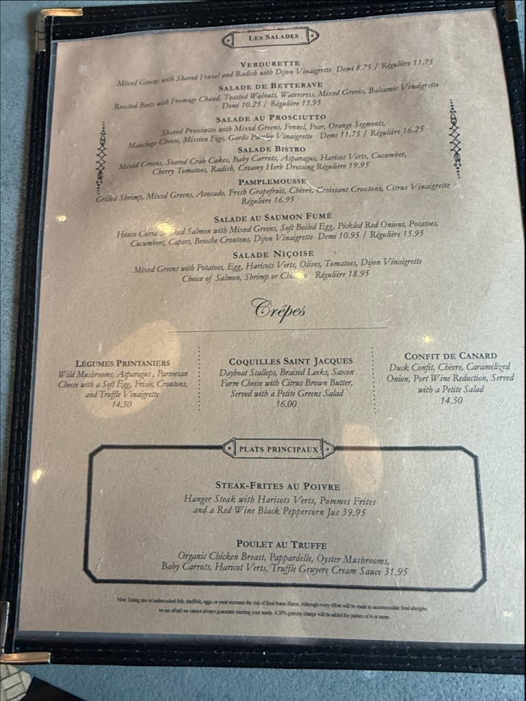 Crepes with scallops was divine. Patisserie were exquisite. Comfortable, cozy atmosphere with knowledgeable and courteous staff. Difficult location for parking, but nestled nicely in downtown.