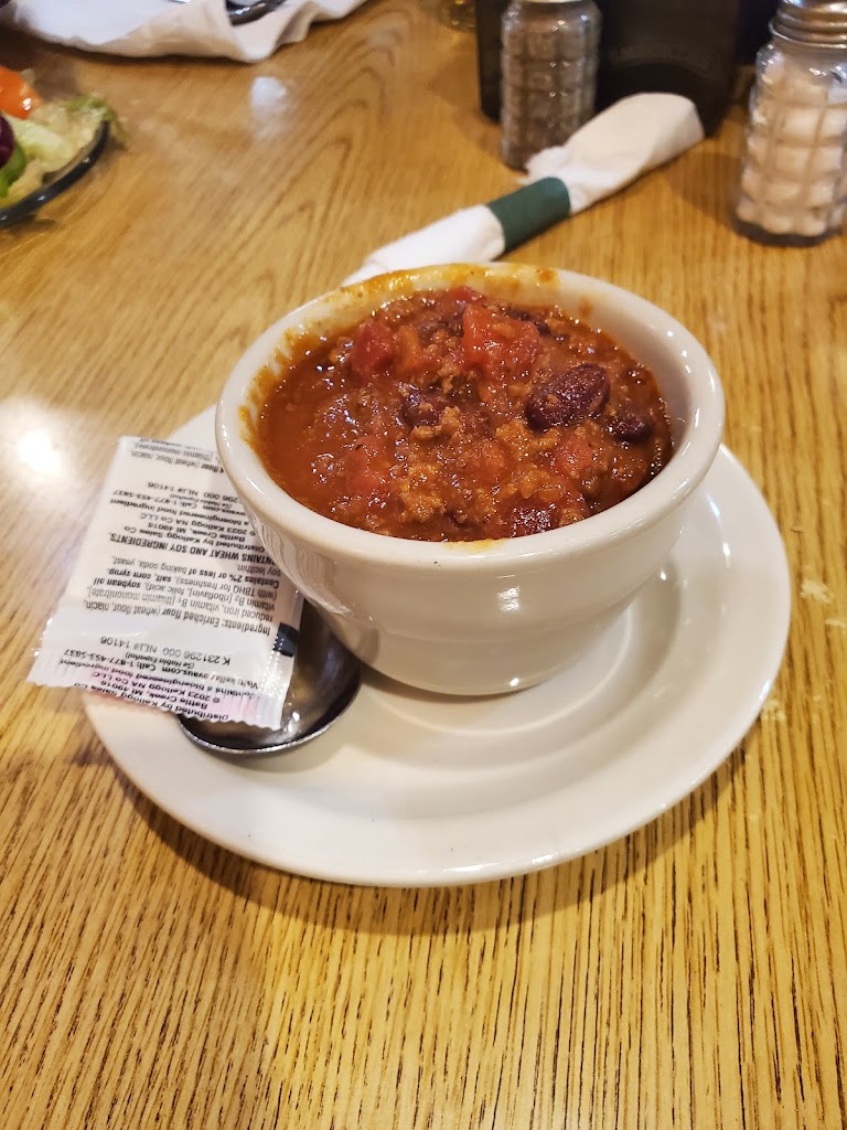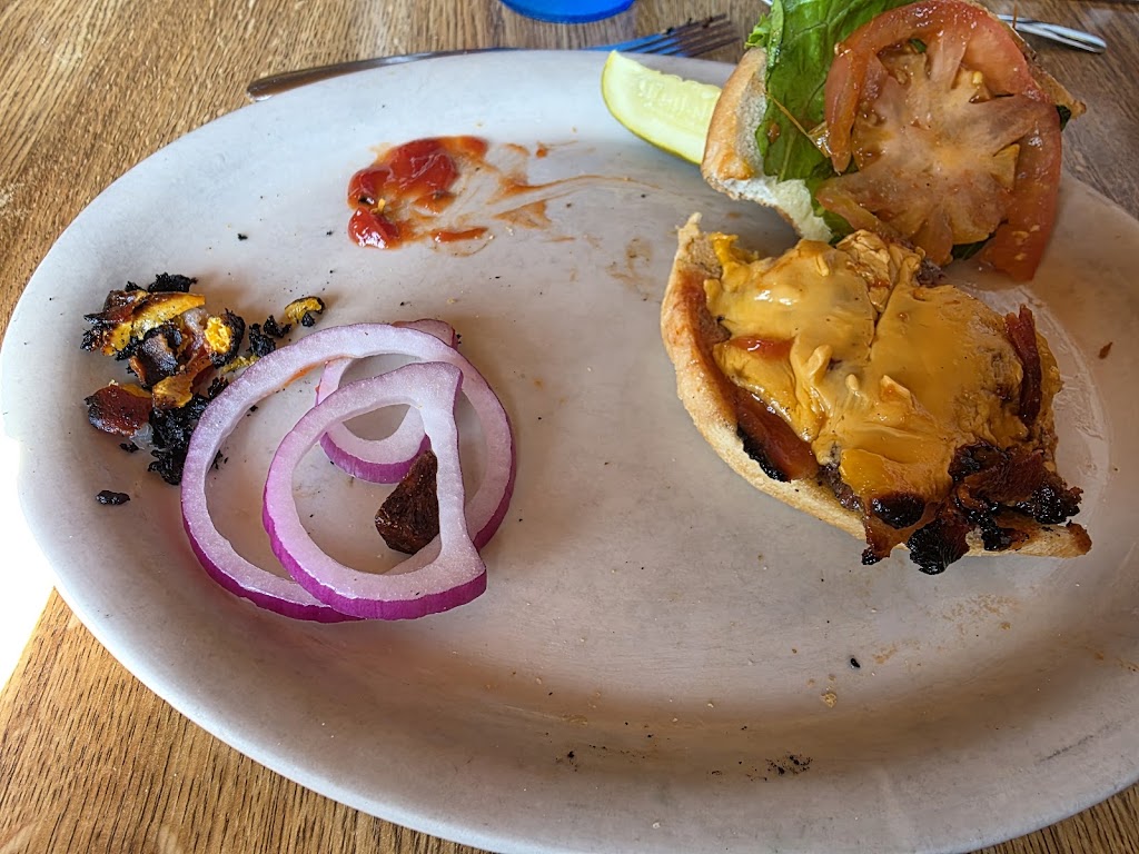 My food burger was terrible. The burger, bacon, and cheese were scorched all around the outside. I broke off a bunch of the black and tried eating it but it was too burnt for me. The cook should never have sent it out to be served to a customer. It was disgusting and I couldn't get the taste out of my mouth. I like burnt brats and hot dogs, but not scorched like this burger was. My husband's burger was good, the fries were good, and the chicken dumpling soup my husband had was good too. It was just my burger that was bad. Loved our waitress. She apologized and didn't charge me for my meal.