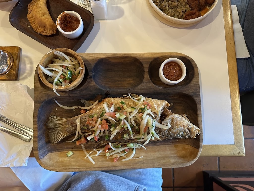 Had a whole fried snapper that lasted me 2 meals. Also, the plantains and bofloto are amazing. Would definitely go again. The dishes offered depend on the day of the week.