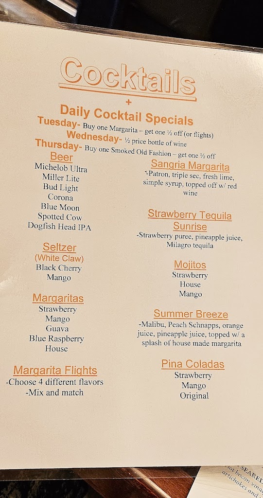6:15 pm, ran out of prime rib. Market Price for standard ocean scallops ( not divers) seems odd. Cocktails and bartender were real fine. Lot of spicy items on the menu. I’ll have to try coming back during a weekday