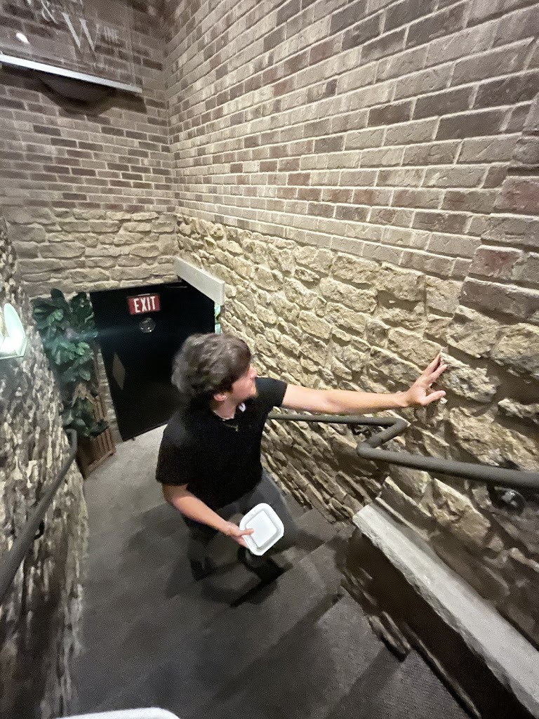 Go downstairs! It is a cozy atmosphere with exciting service and a full menu. Brian is the most entertaining and attentive barkeep we've had the pleasure to be served by. The food was excellent and the service was beyond expectations. They should consider hiring Chase to assist when times are busy.