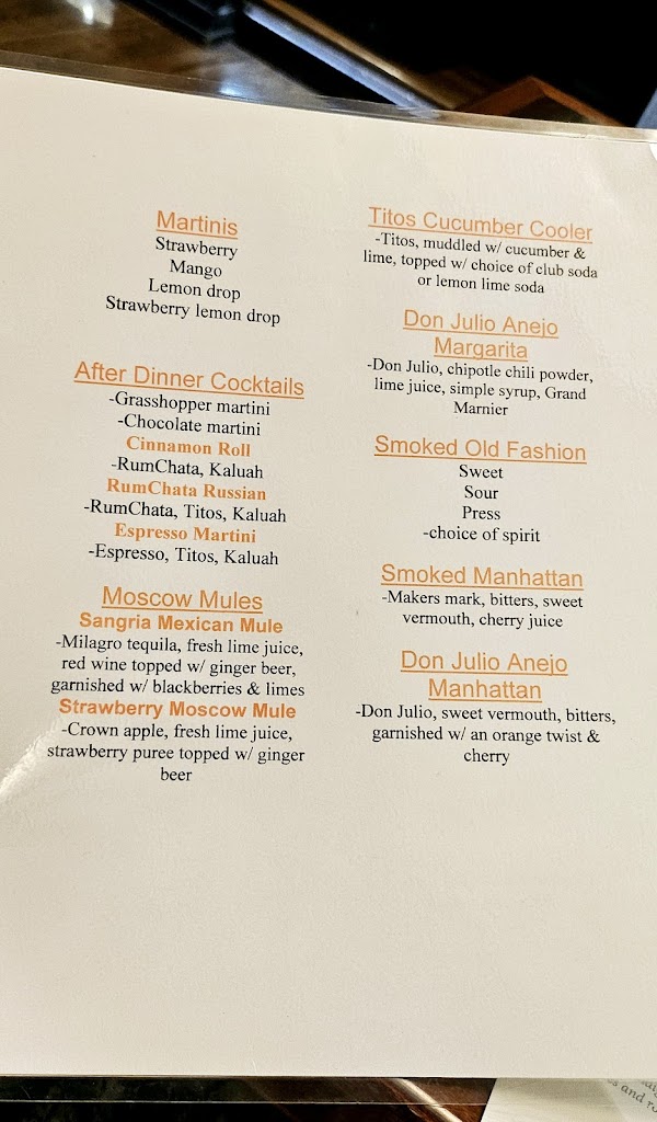 Nice Cocktail menu, Great service. We had the shrimp cocktail appetizer and lobster ravioli and Ribeye steak. My wife and I were happy with everything!