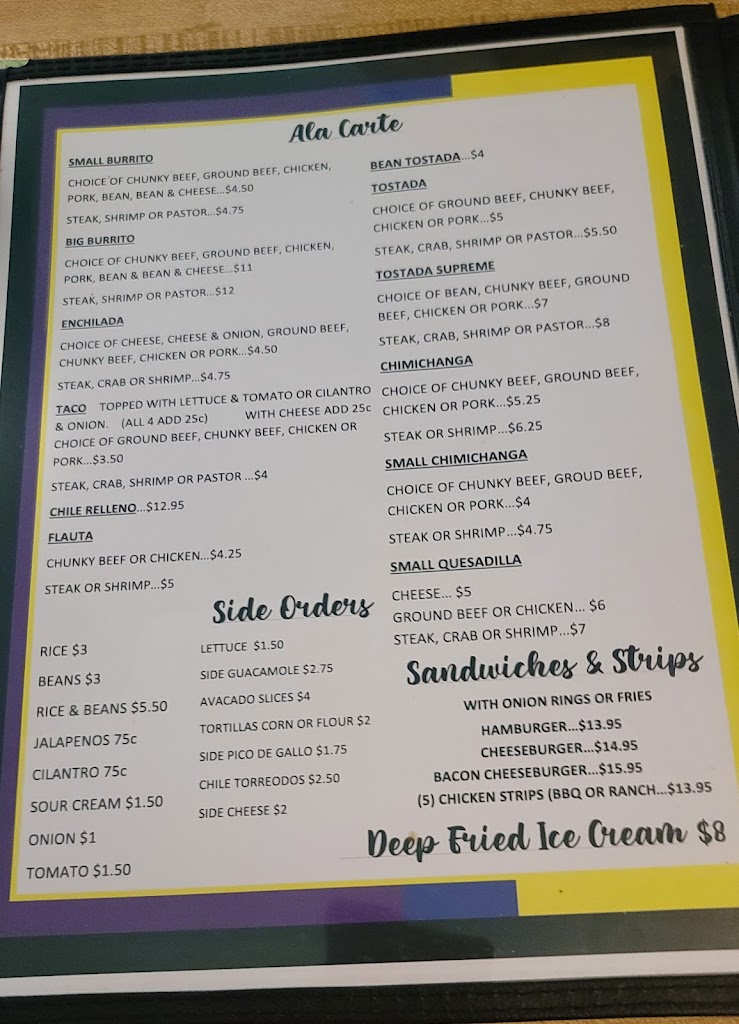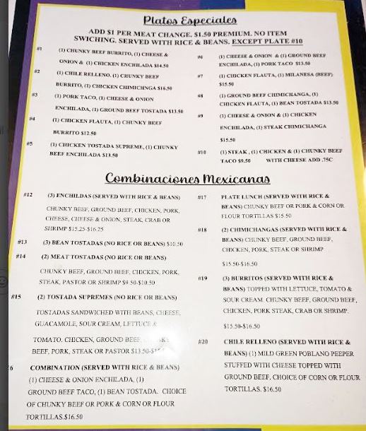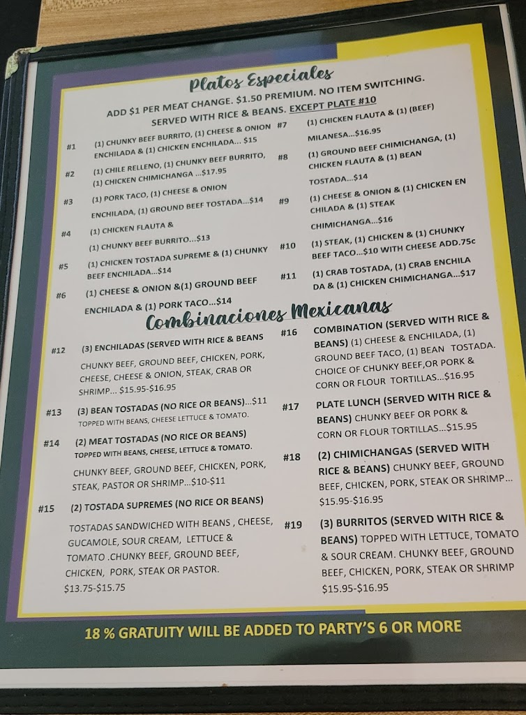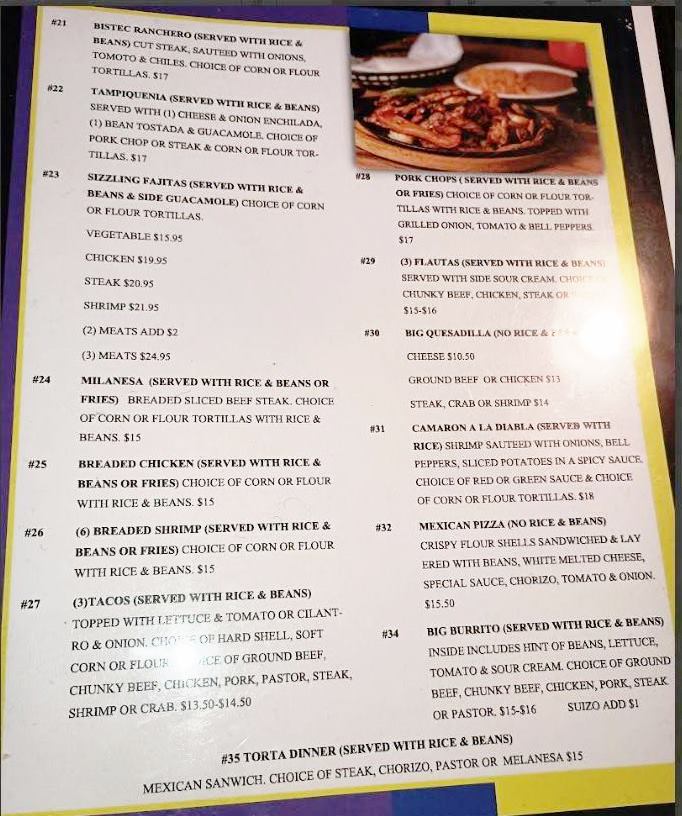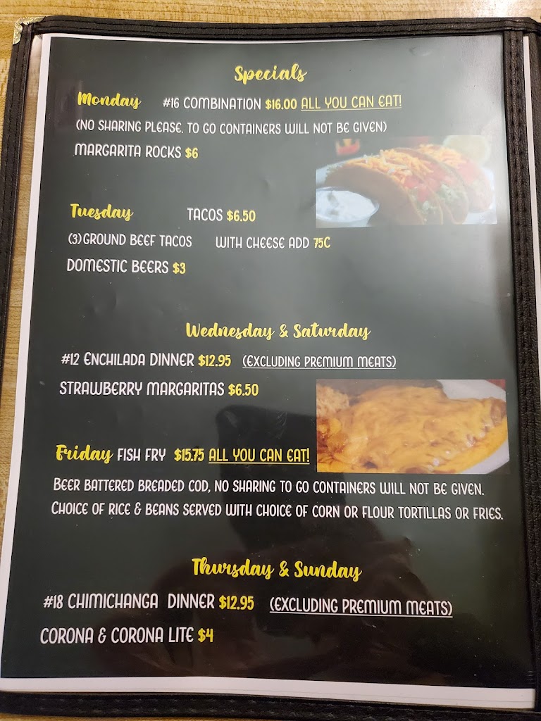Good to have semi-authentic Mexican food. The attached menu photos are from Feb 14, 2025. We wish they'd provide take out menus. Maybe they're like some restaurants who discourage take out?