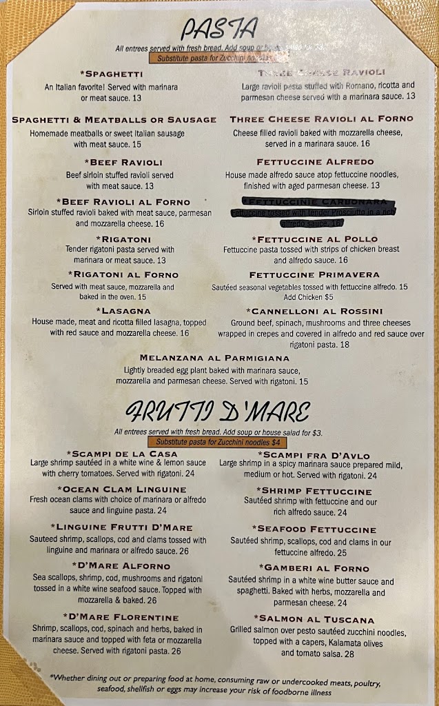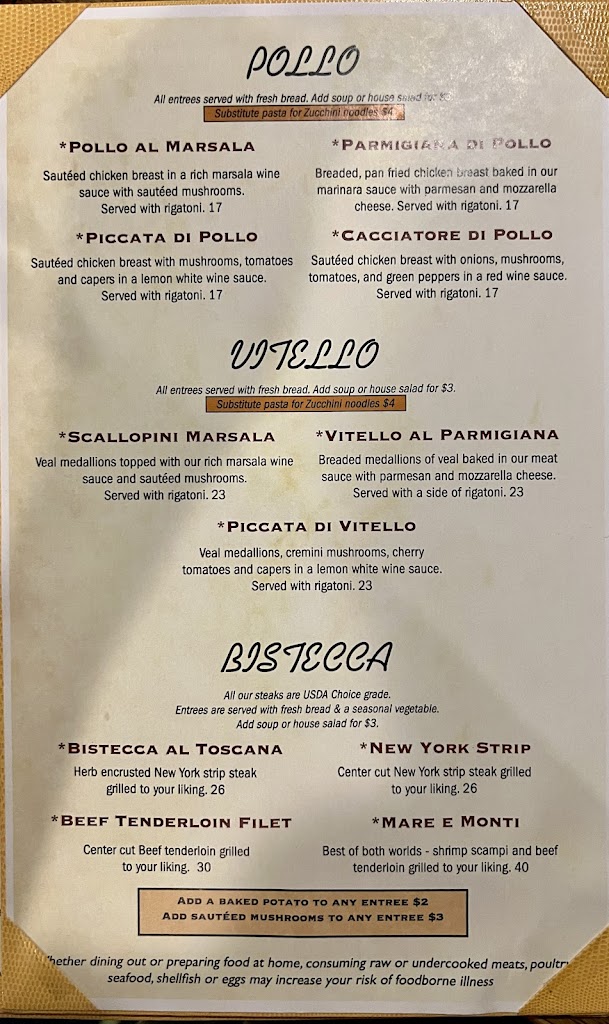 Very disappointed, the only thing that was good was the bread! Chicken Marsala was breaded chicken and brown gravy from a can with noodles and mushrooms. No flavor and definitely not Marsala. My husband ordered the ravioli, looked more like chef boyardee like we ate as kids with more sauce and cheese. He said it had no flavor.