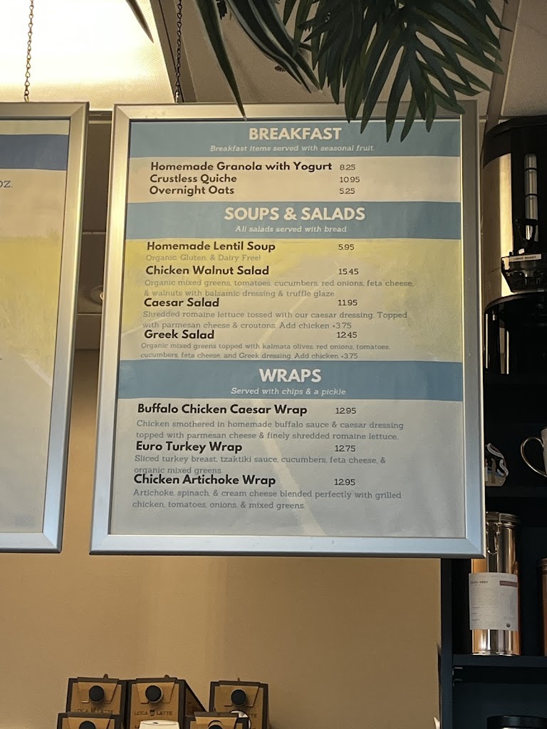 The menu is a nice variety, and the Mocha with almond milk was delish. My friend got a smoothie, and it was really good too. The Cinnamon Roll was crazy good and big! The options range from sandwiches to muffins to hot and cold drinks. There is also a range of local artisan items for purchase inside. Coffee for home brewing is also available.