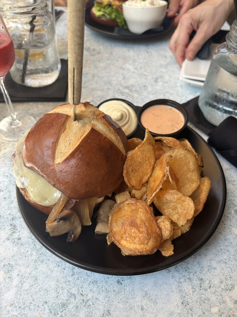 Dined there with my siblings and their spouses for a late lunch. Food was good but I do not eat any dairy so ordered a bean burger without cheese. Did not realize I could sub fries for a charge instead of chips. Are one chip and realized they had a coating of maybe ranch in them. No where in the menu did it say they added any dairy to their chips. I opted to not eat them. Did not have any medical issues thank god from the few I did eat. So please in the future don’t add that to your chips or put on your menu that you add ranch to their chips chips.
