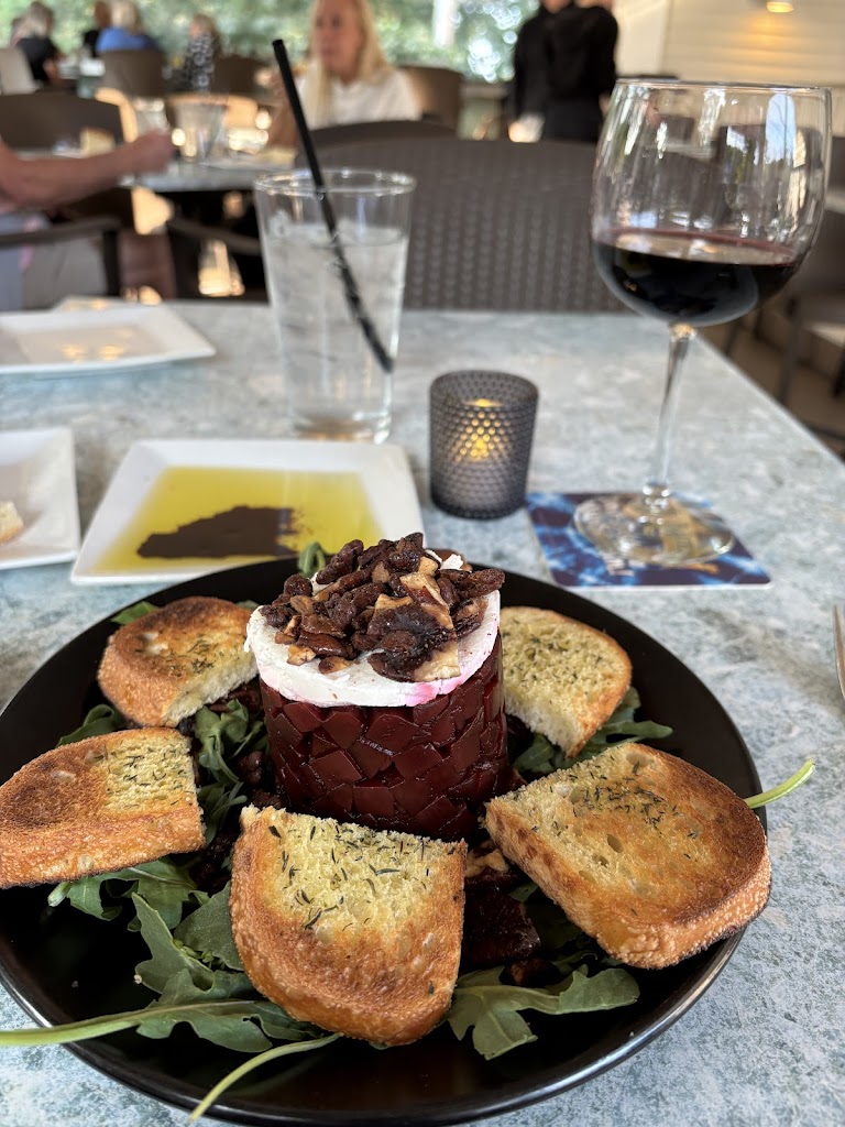 We enjoyed the Addictive Asparagus and a gorgeous beet goat cheese tower appetizer, chicken mushroom asparagus, grilled garlic shrimp, and a curried zucchini noodle dish was a great gluten free entree. A chilled crisp bottle of rosè was the finishing touch. Lovely summer memory.