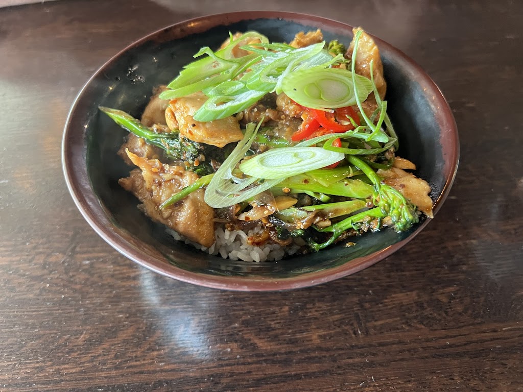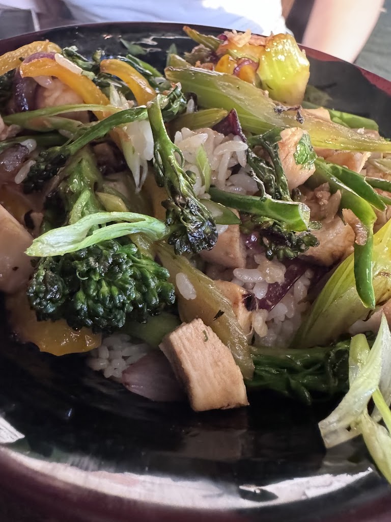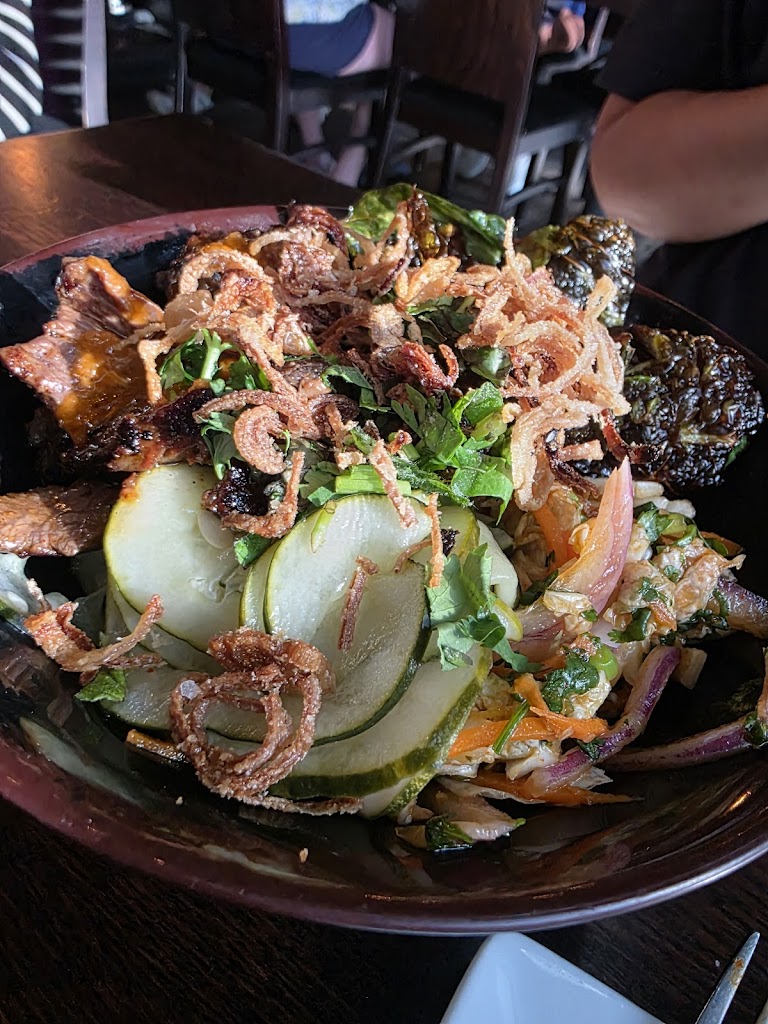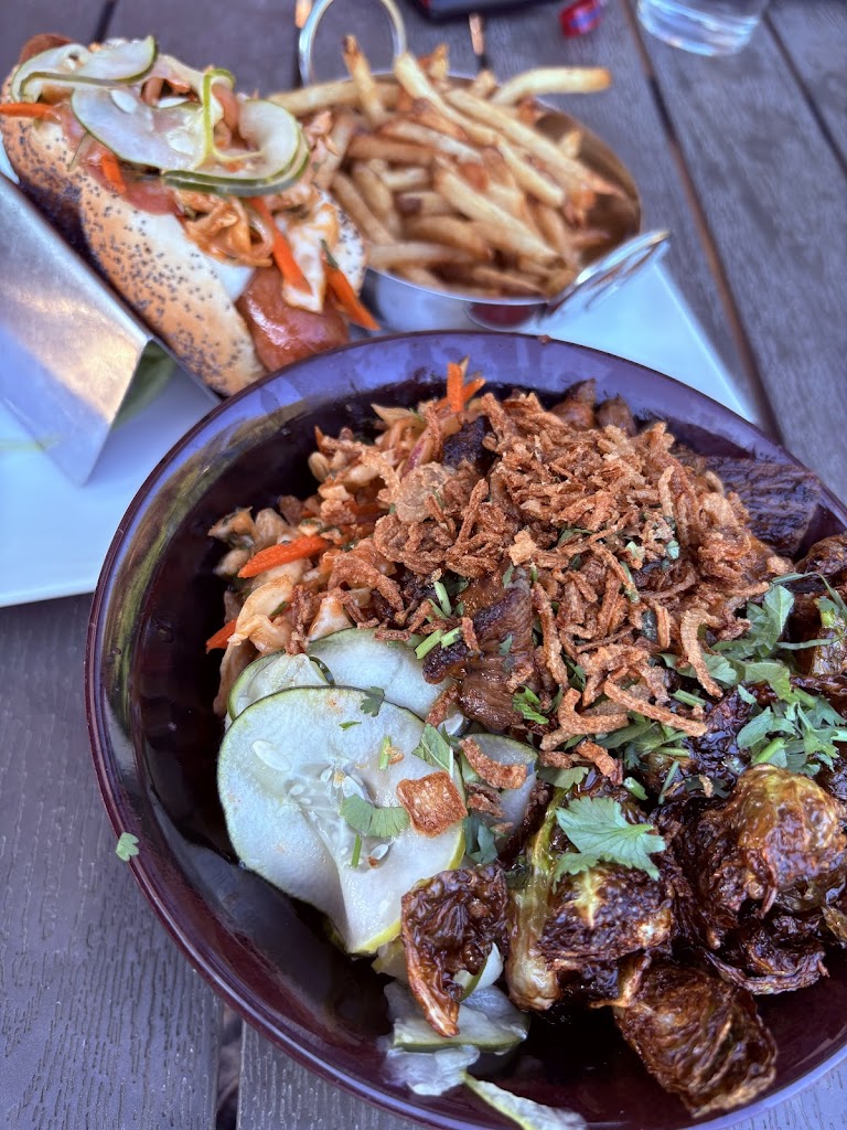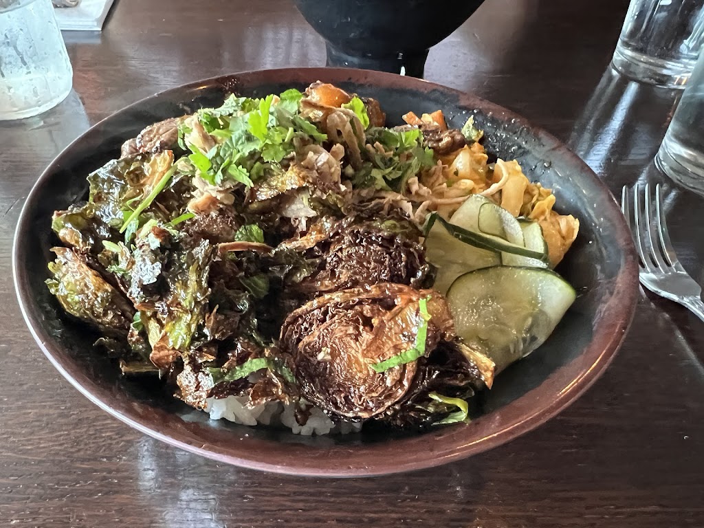 Hanger Steak Sticky Rice Bowl: Delicious mix of sweet and sour with the pickled cucumbers and Korean BBQ steak. The Brussel sprouts add a nice crisp. Loved it.