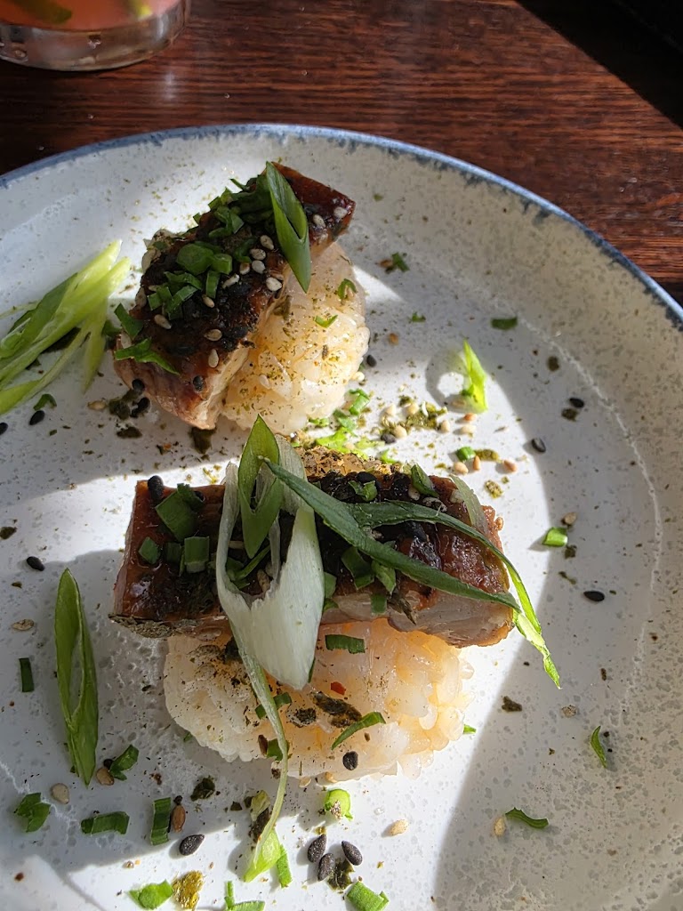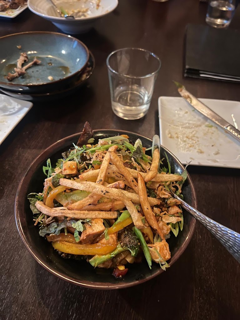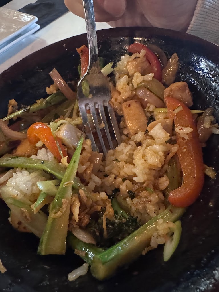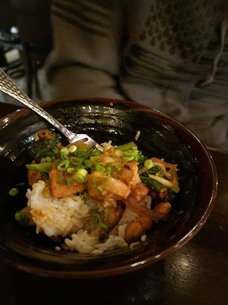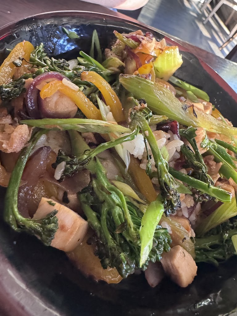 Hanger Steak Sticky Rice Bowl: Delicious mix of sweet and sour with the pickled cucumbers and Korean BBQ steak. The Brussel sprouts add a nice crisp. Loved it.