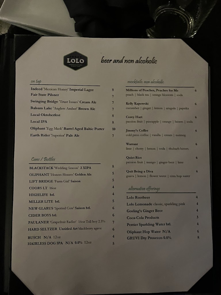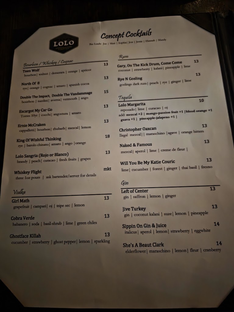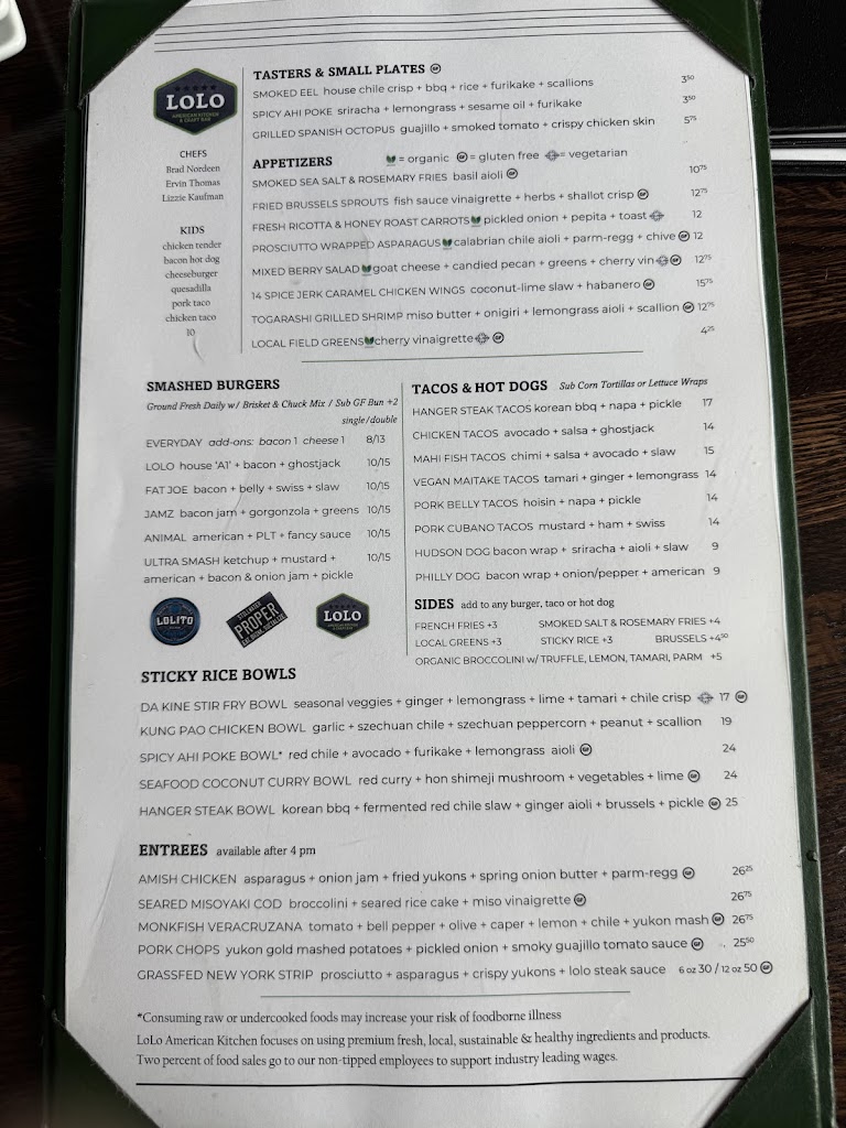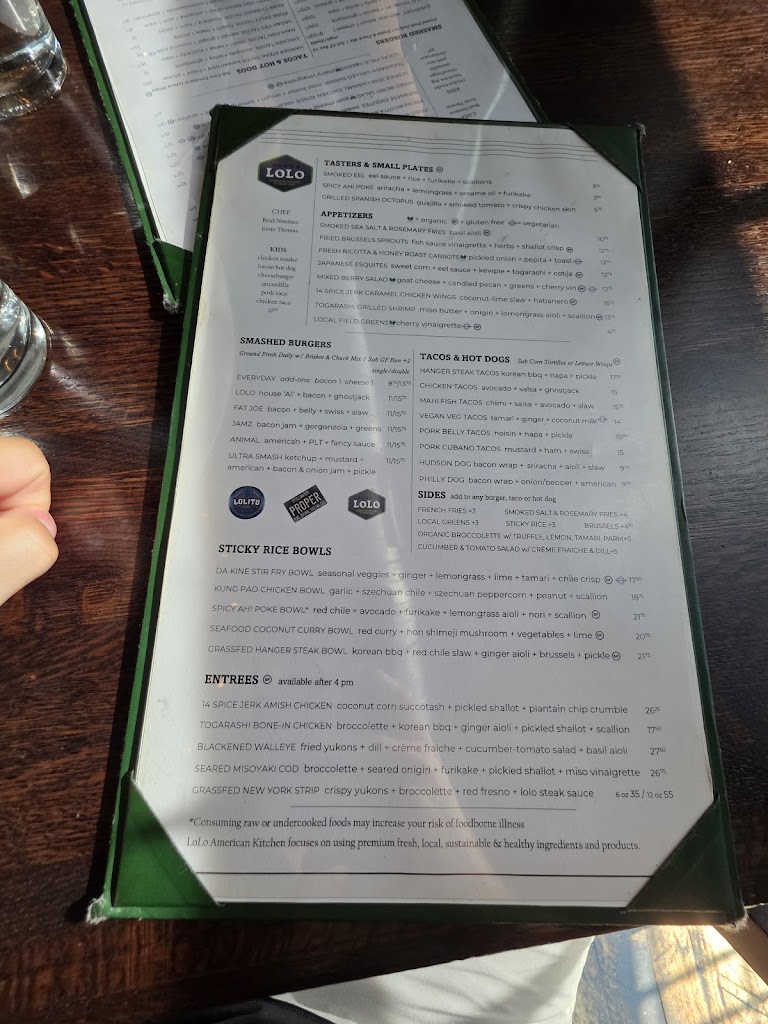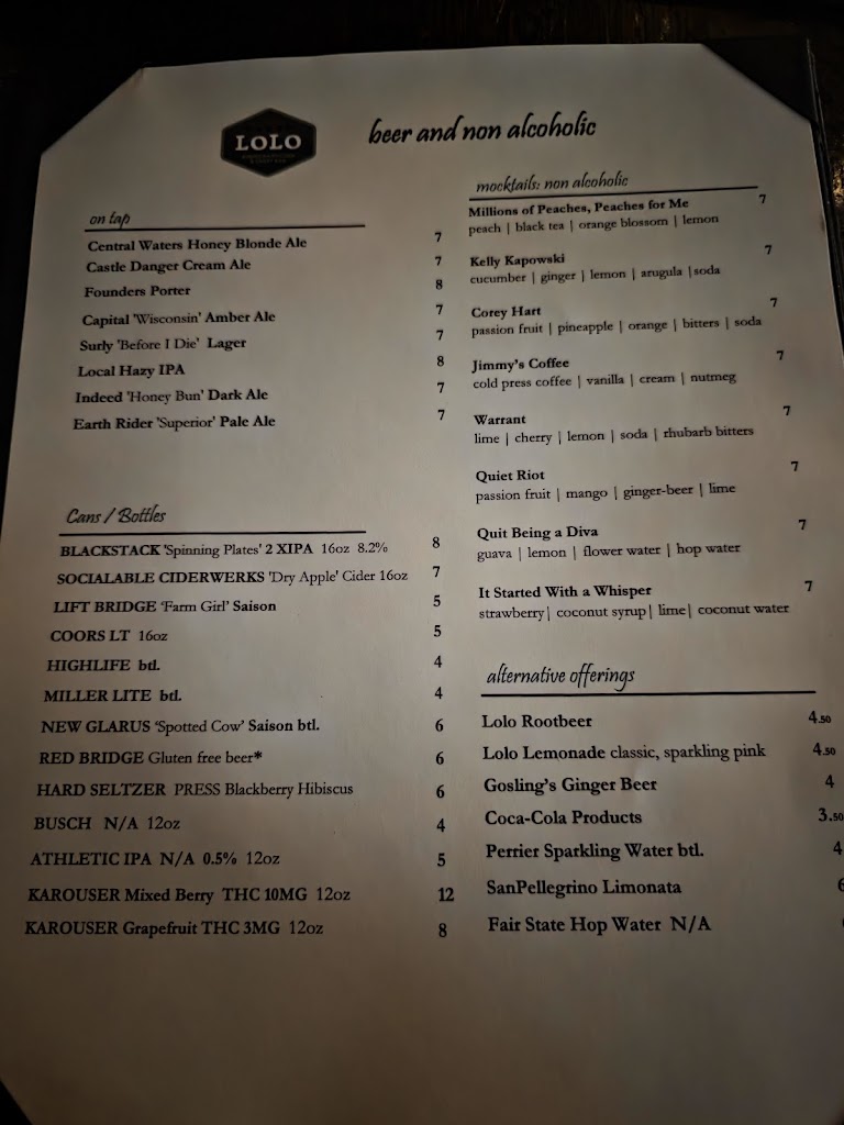 I thought Lolo was an approachable upscale restaurant with chef curated dishes and quantity craft cocktails. But I was very surprised to get a different experience when visiting on July 3, 2025 around 7pm. After seeing the menu of hot dogs, tacos and smash burgers I asked our server if this is their summer menu, and I was told, "no, this is our normal menu". I was very disappointed with the perceived low-end options at high-end prices and struggled to choose an entree.