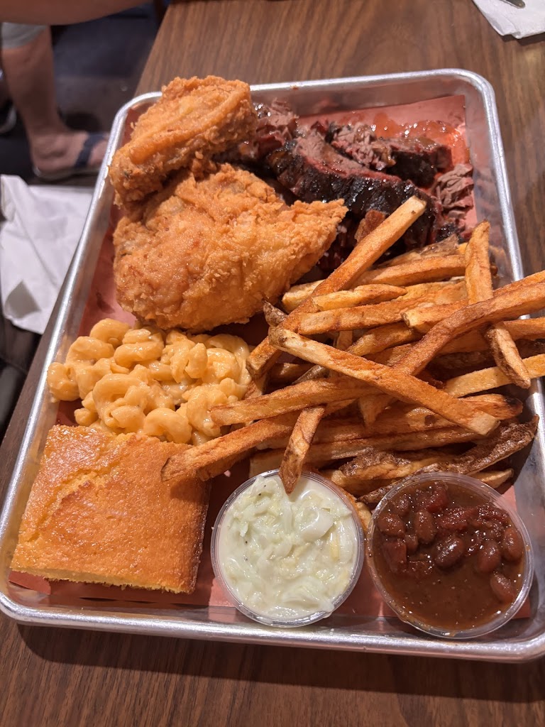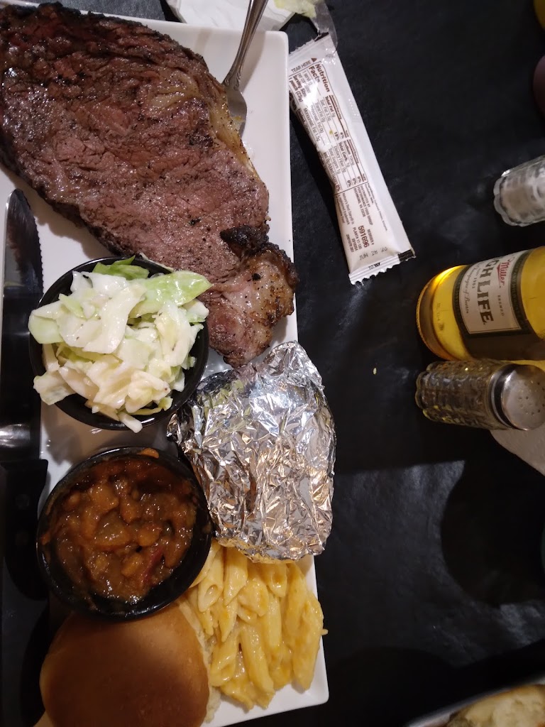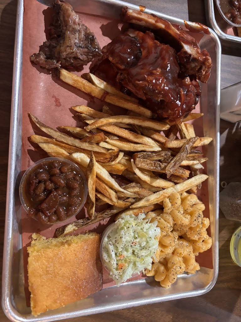 The food was amazing. The brisket was tender and flavorful, ribs were amazing. I liked the presentation of the meals, on a metal tray/plate, with very good mac n cheese, cole slaw, and amazing corn bread. The bar was nice. My 4-star rating would be because once you enter the dining room, thats a bit odd. It was a bit unkept and was not a nice dining atmosphere at all. But, the waitress was amazing and the food was also amazing.