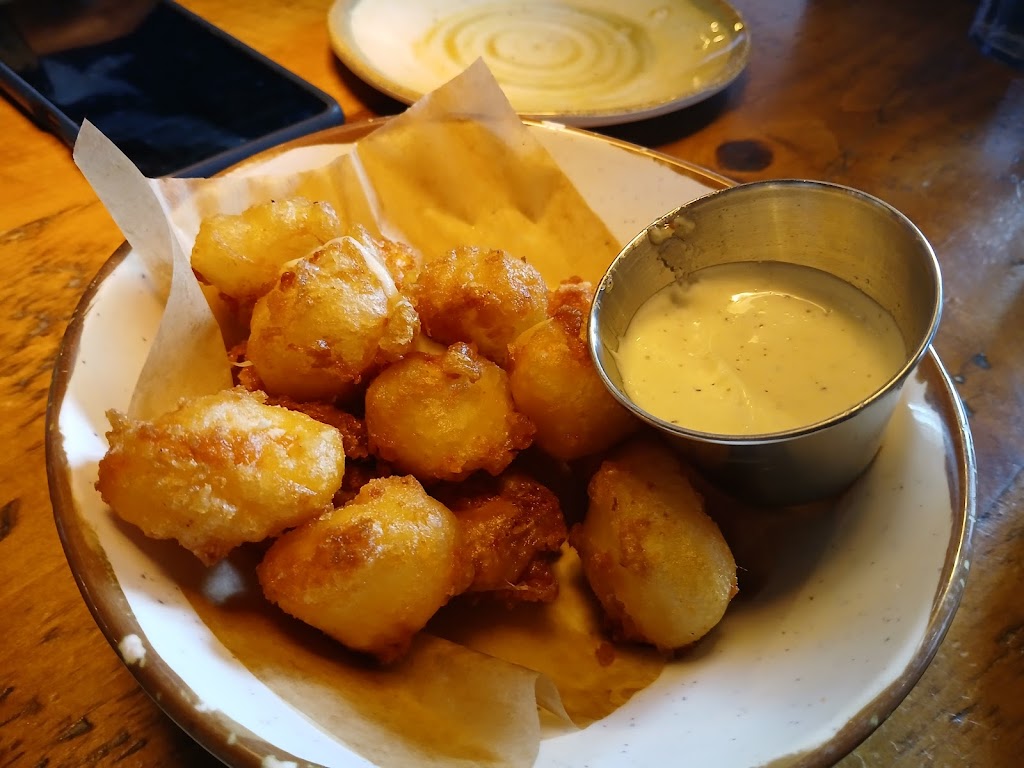 The salad with an apple cider vinegaret and the addition of smoked trout was very good. I did enjoy the New Glarus Raspberry Tart beer, which had great Raspberry flavor. If you like fried cheese curds, their's is a must try. The batter is light and crispy, yum!