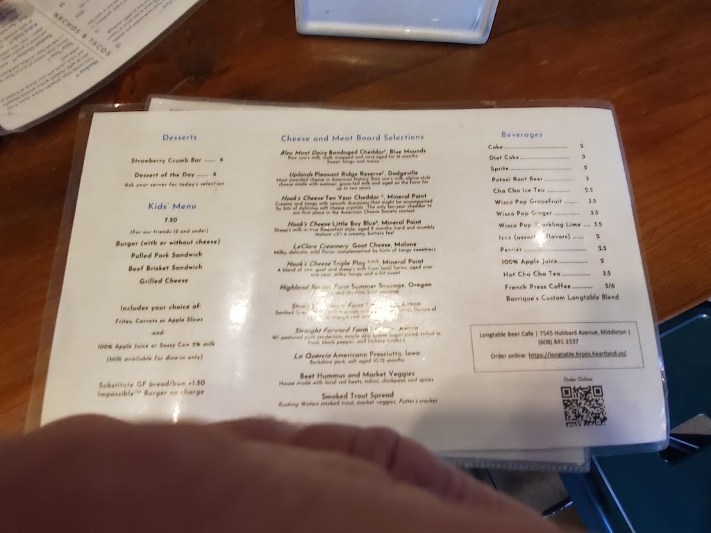 Was very impressed with Longtabe Beer Cafe. Was recommended by several locals and I would now recommend as well. Very nice beer selection and great food menu. The grilled cheese was awesome (it is Wisconsin after all) and the cafe offers several outdoor tables. We went on Saturday night after Badger football game and the place was busy but getting table was not a problem. Great service, great menu and reasonable prices with a nice atmosphere - recommend you check it out !