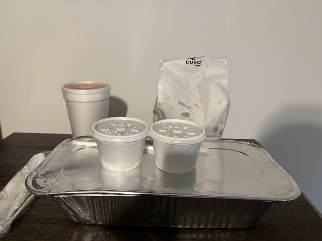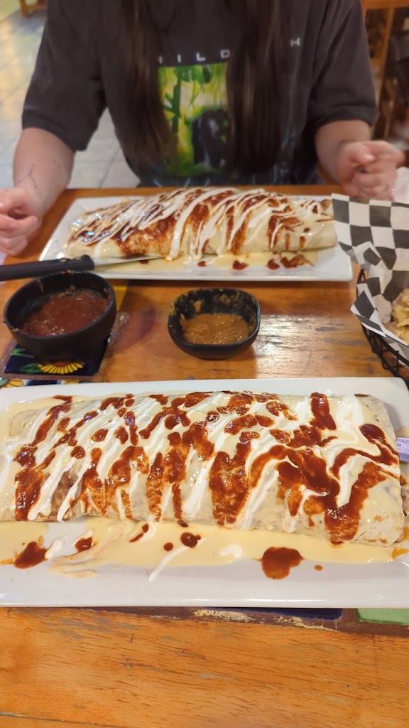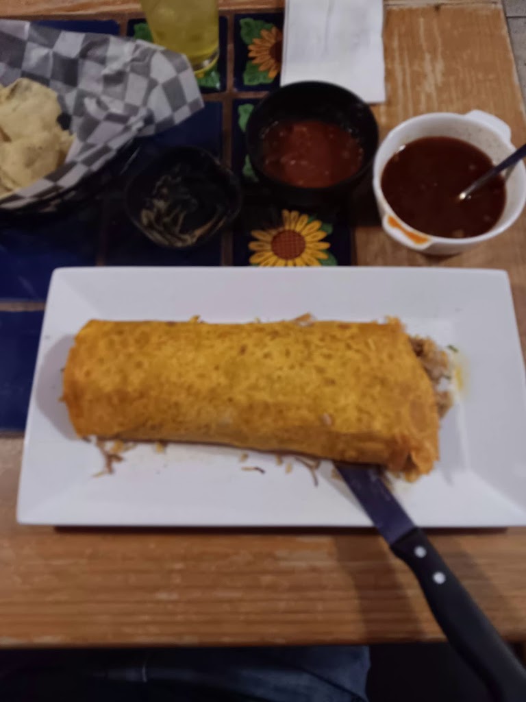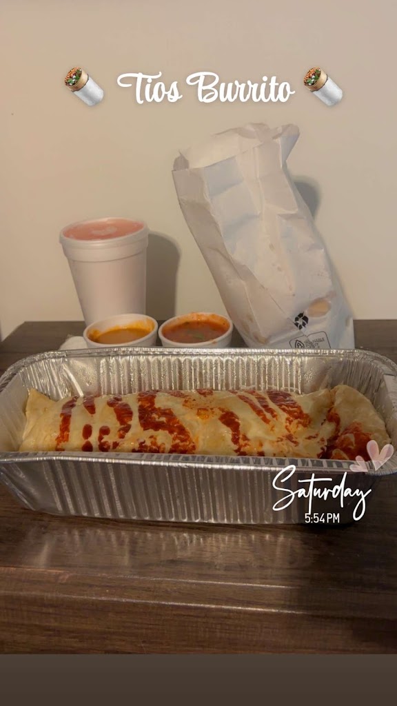 The Tios Burrito is huge, enough for a large family, it comes with baked tortilla chips and salsa and refried beans. I also got the strawberry lemonade. This is from door dash delivery, I ate there and they are nice.