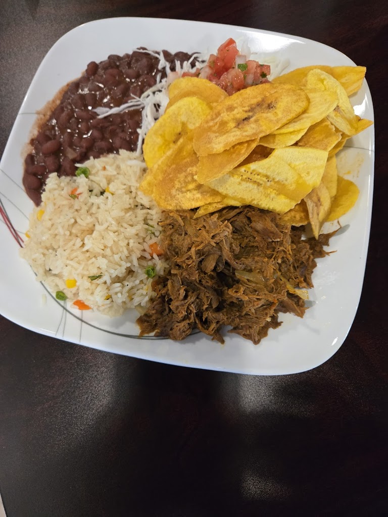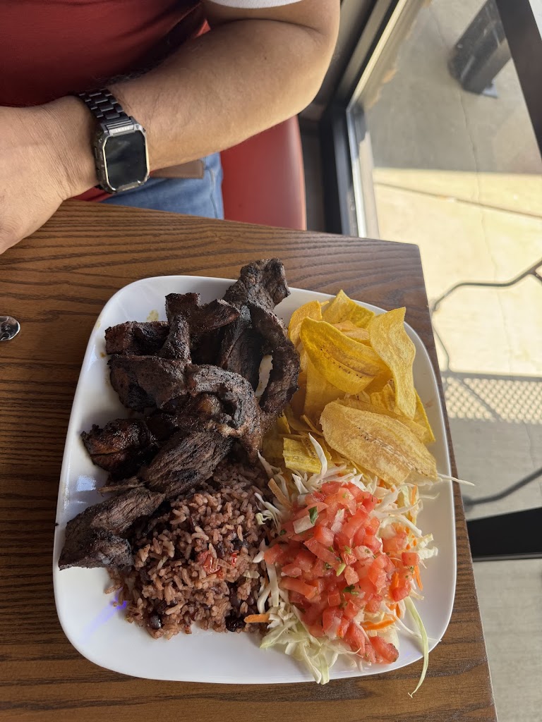 The food was amazing. I'm not sure of the name of the dish. But it was pork with plantains, red beans and rice. And, it also came with a shredded cabbage salad. Great service.