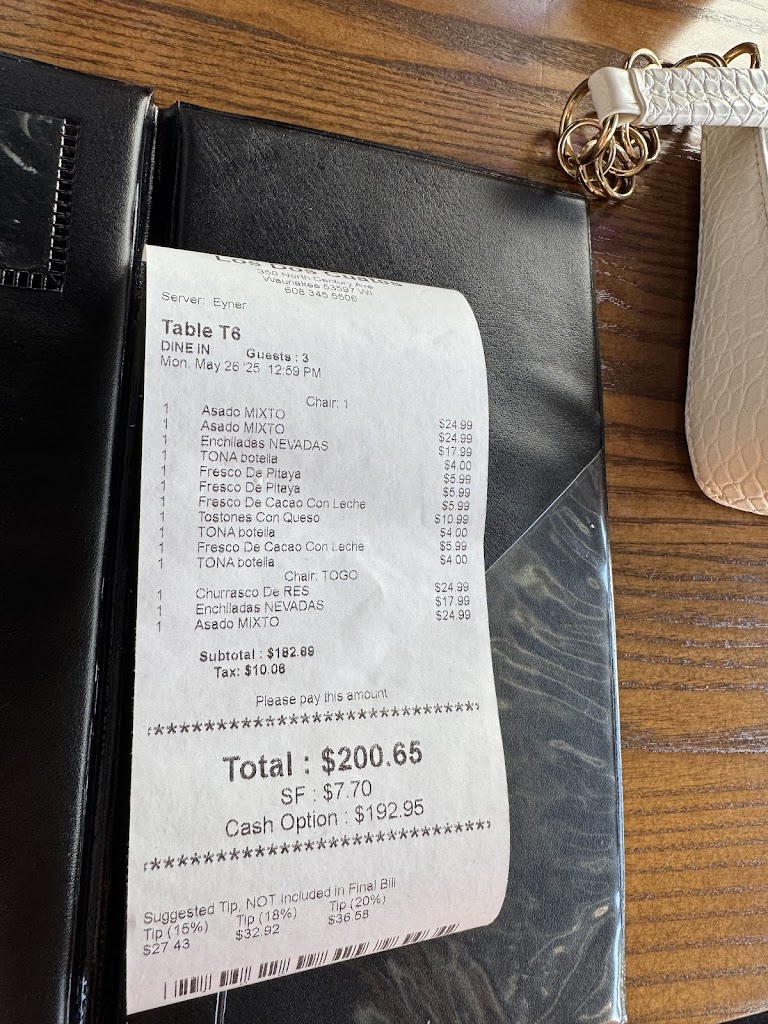 La comida estaba muy buena, la Carne Asada Mixta 10000/10 estrellas , la enchiladas nevadas eran completamente llenas de Carne nada de arroz, los tostones y el queso muy bien pedí un cacao que estaba delicioso. Quiero agregar que tienen una pequeña terracita afuera que estaba muy bien… En general todo bien aunque es un poco caro pero vale la pena por la comida ya que es excelente y es bastante!!!