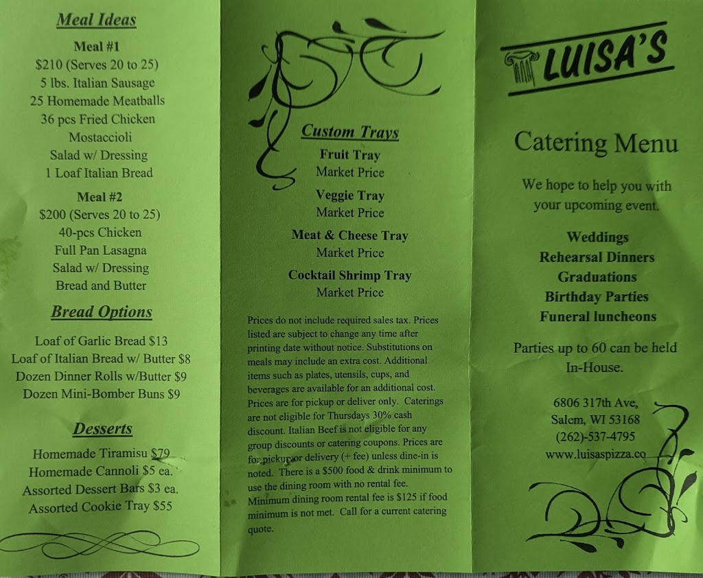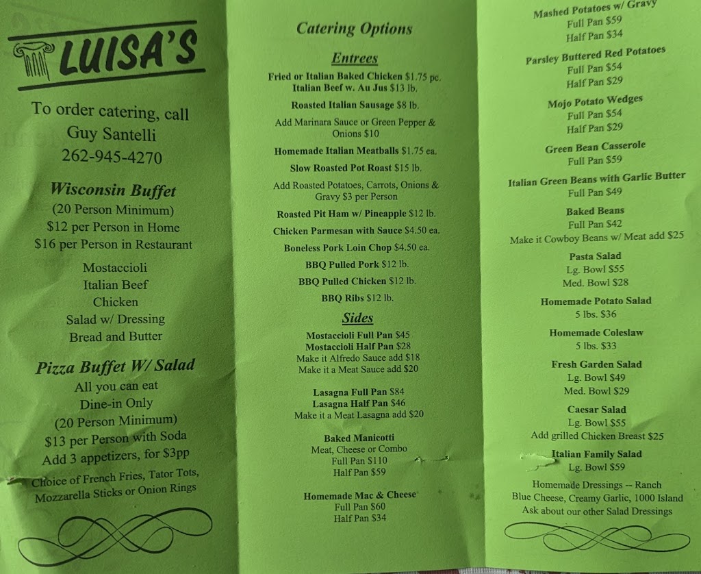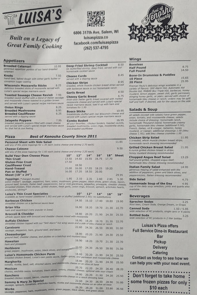 Sorry to say I am done with Luisa's. Went there a while back during Country Thunder and they were closed for lack of help. Went there 2 weeks ago and they were closed for private party. Not wasting any more gas for unreliable pizza place when there are so many, and they obviously have enough business.