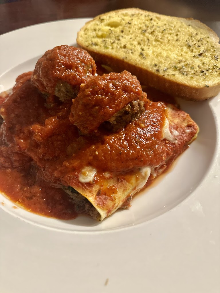 We started with the garlic knots—there was a generous portion for the price, and they were pretty tasty. My mom and I both had the stuffed manicotti, which came with two meatballs, a salad, and a piece of garlic toast. The garlic toast was actually better than the knots —perfect amount of crispiness and flavor! The manicotti and meatballs were good, though the meat filling was a bit on the dry side. My dad ordered the sausage and cheese pizza and enjoyed it.