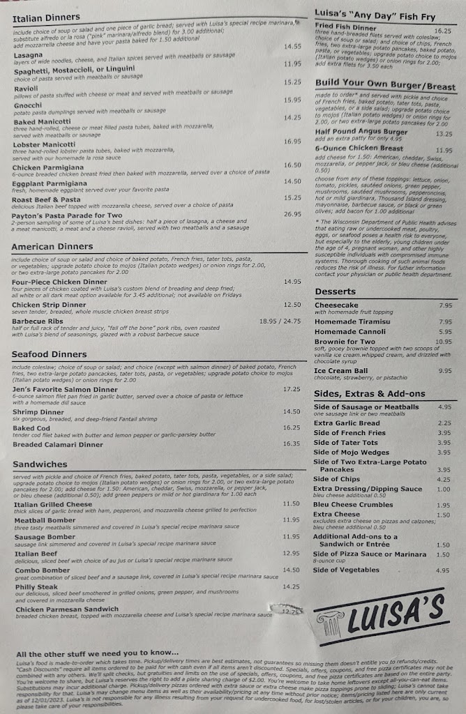 Our family has been ordering pizza from Luisa's for years. It never disappoints, hands down the best place to get pizza in the area. Last night I decided to try something new besides the pizza. I ordered the lobster manicotti. It was awesome!! The sauce was amazing and the lobster chunks in there were great. A lot of places will skimp you on the seafood part and you'll get maybe one chunk here and there, not Luisa's there were good size lobster chunks the whole way through. I definitely will be ordering this dish again! The staff is always friendly, they are always ahead of there estimated delivery time and the restaurant is always clean and a friendly environment. Definitely highly recommend. You have to order the Lobster Manicotti! We've never been disappointed in anything we've ordered.