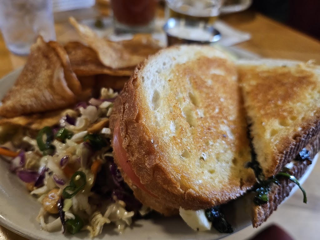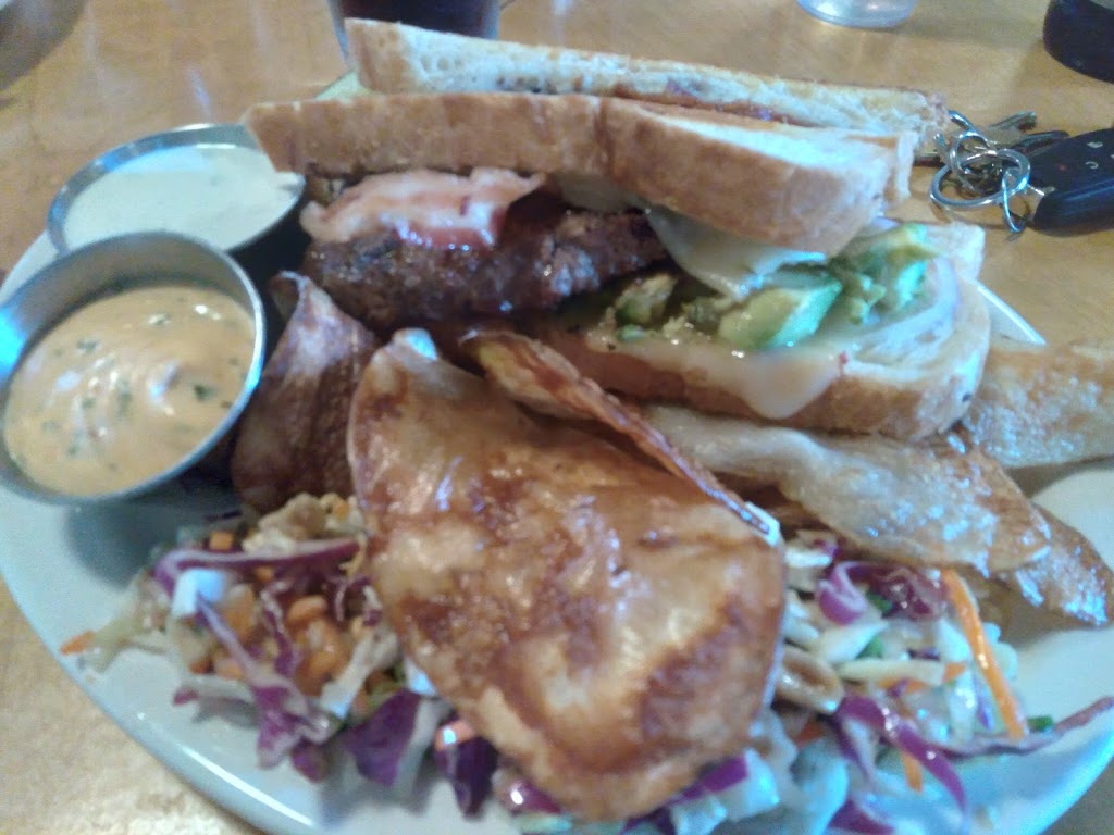 The food is outstanding. I had this week's special - Pepperjack Pub Melt, and Mom had the Mediterranean Steak Pita. We both opted for the little bit of each on the choice of House-made Potato Chips and Asian Slaw. Portions are definitely NOT an issue. There is so much food I was almost full just LOOKING at the plate. And let me say it is ALL super delicious. I wasn't really sure about "just having a burger," but the special was intriguing. Served on toasted bread, with pepperjack cheese, and had slices of fresh avocado, with a side of pepperjack mayo that was just the right amount of kick. Of course you can increase and decrease the kick by how much you put on the sandwich. Perfect. The chips with the bleu cheese dip, and the Asian slaw are equally tasty. Very nice flavor combinations. Could only eat half and have the rest in the fridge at work for lunch today. So excited.