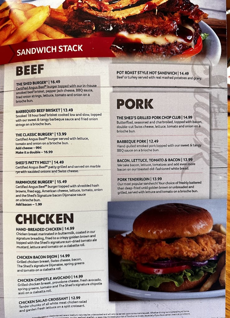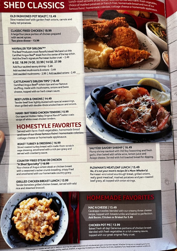Love The Shed. First time at this location, but it was everything we expected. They have the best cole slaw in the world. Great food. Nice pricing. The staff were great. Love the ambiance. Plenty of RV parking room.