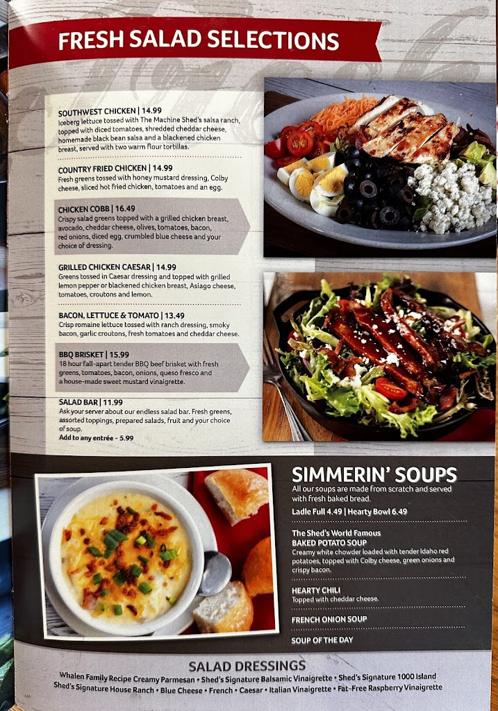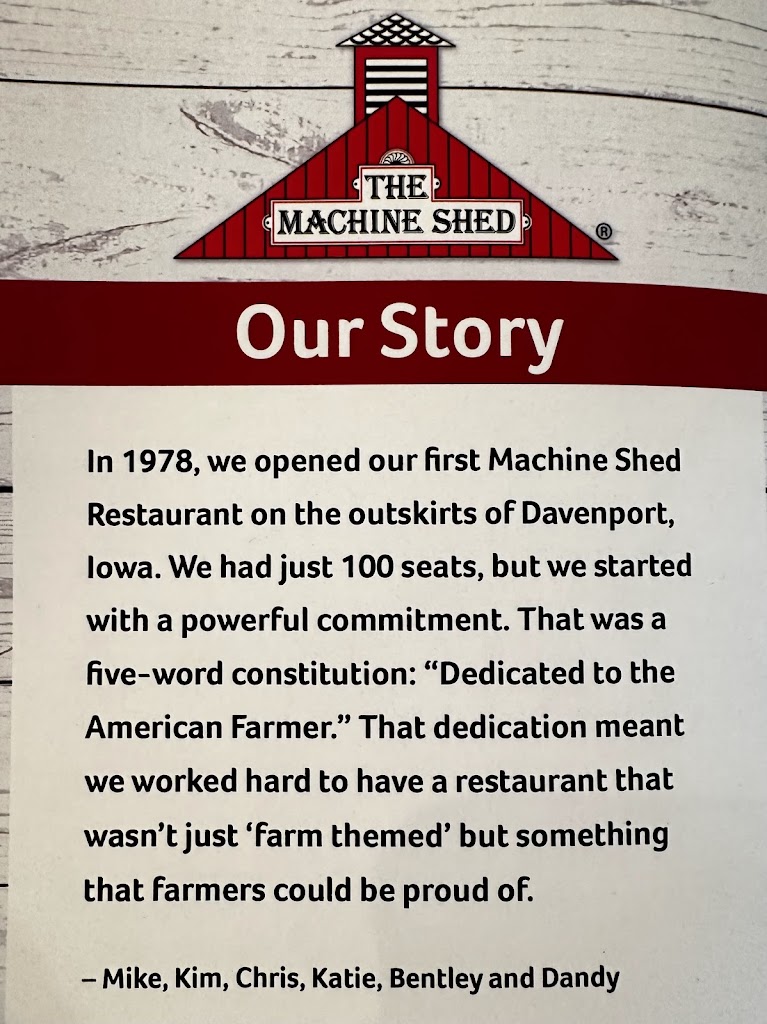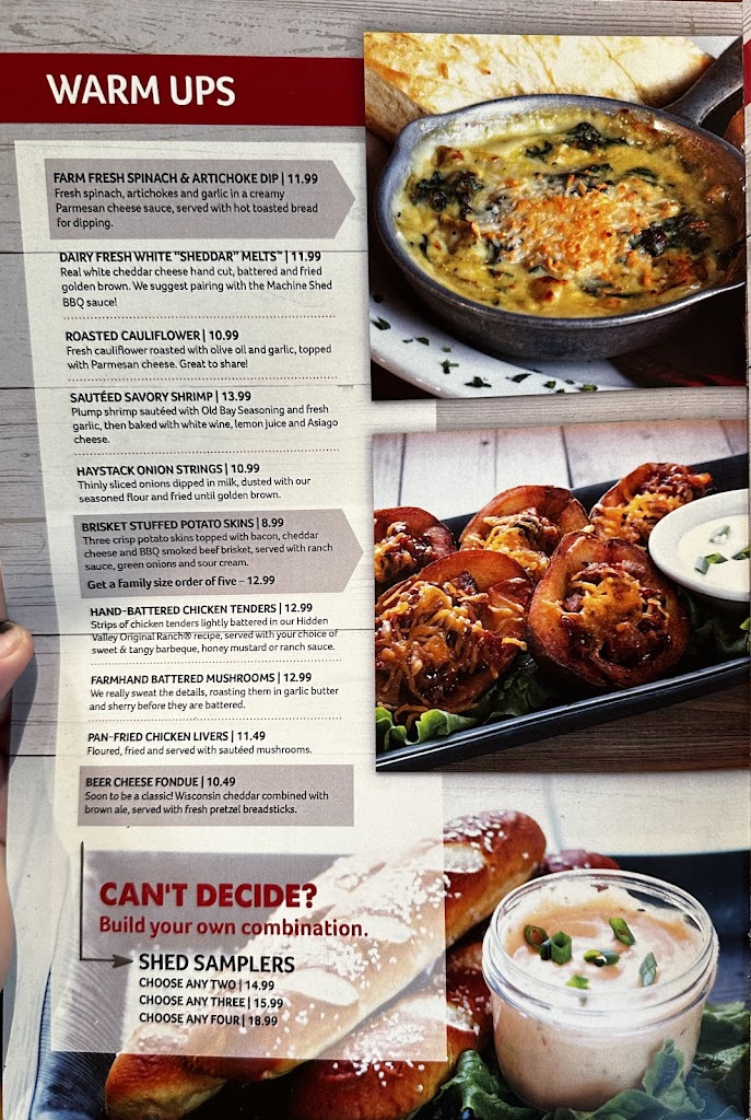 we love the machine shed in Des Moines, IA and really looked forward to this, but despite staffing challenges at both sites, Appleton needs to re-evaluate their management. I even got a dirty look when I mentioned the need for toilet paper. Wow!