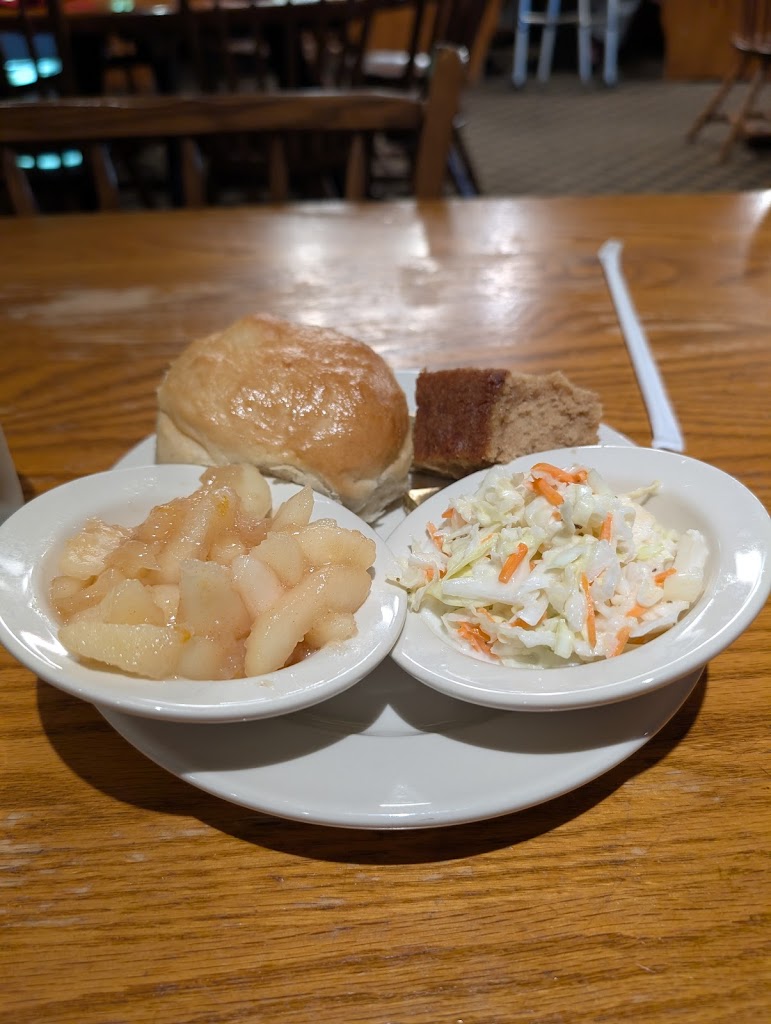 Our first time here and will be returning. Very pleasant and friendly staff. Our dinner came with homemade bread. I haven't had homemade bread in a long time. It was very good! I had the catfish dinner with sweet potato fries. This dish was very delish. My husband had the full slab of BBQ ribs with fries. It was so much they that he couldn't finish it. My son has the combo and he couldn't finish it all. We ended up taking a slice of Snickers and apple dumplings pie to go. Cannot wait to have some tomorrow with my coffee. I would recommend this place to everyone.