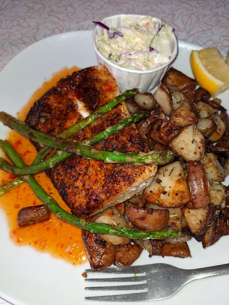 Great blackened Mahi Mahi. Used to it always being seared rare and this was cooked all the way but it was amazing and so was the pirate rum sauce. Definitely recommend. (I ate the asparagus and potatoes before taking the photo)