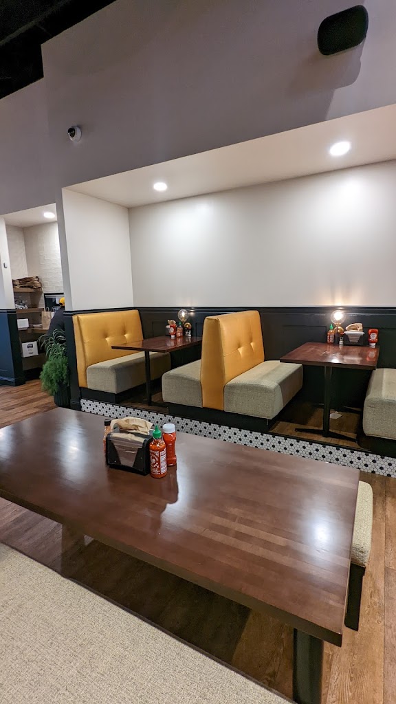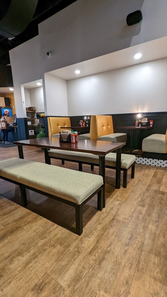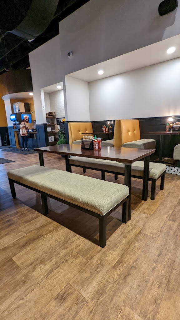 The food is good, but unfortunately, the place seems a bit understaffed, so you typically have to wait a bit in line, since the person at the register is also bringing people their food. Additionally, if you decide to dine in, almost all of the booth tables have this very annoying lightbulb right at eye level that will bother you throughout your entire meal. There are only two booths by the window, one long table in the middle of the dining area, and one uncomfortable bench by the window that don't have this issue.