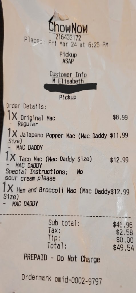 Food was hot and delicious although there was a slight mix up where added bacon was requested on one dish but was put on another person's dish instead in our party. Other than that Macs is always a delicious option and super filling!