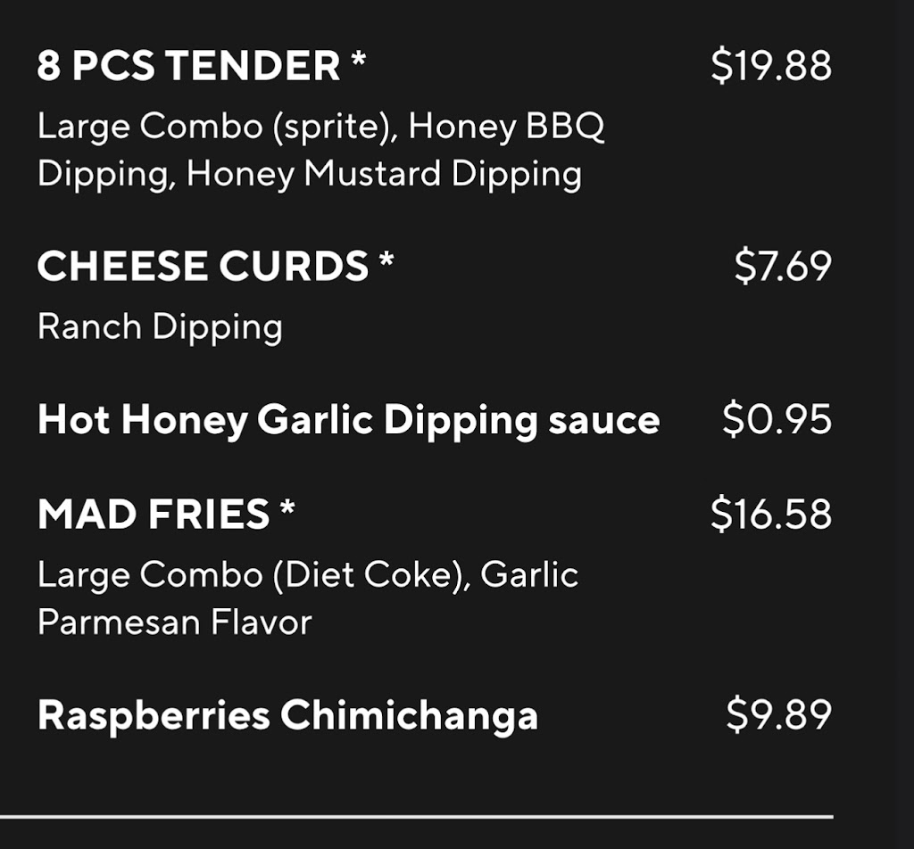 Look, I’m don’t want to be this person, but in this economy, every dollar counts. I just had an employee from the store Try to gaslight me and say that they don’t charge higher prices for their pick up. Here are photo evidence of what’s on their menu versus what I got charged. She tried to tell me I did it through DoorDash. I showed her step-by-step where I went through on the website. And then she just went silent and didn’t follow up with anything because she had nothing to say to me. You can clearly see it in the raspberry chimichangas at least. And, you cannot say that that is the price with tax included because I did get charged tax. I just cut off that portion of the photo because it also gave my card information.
