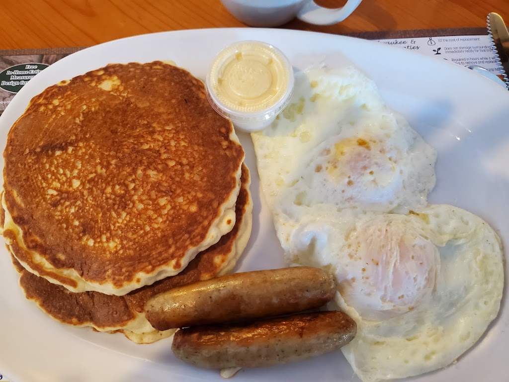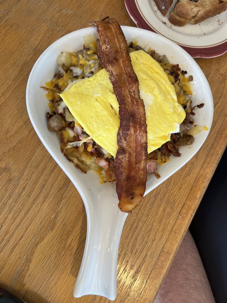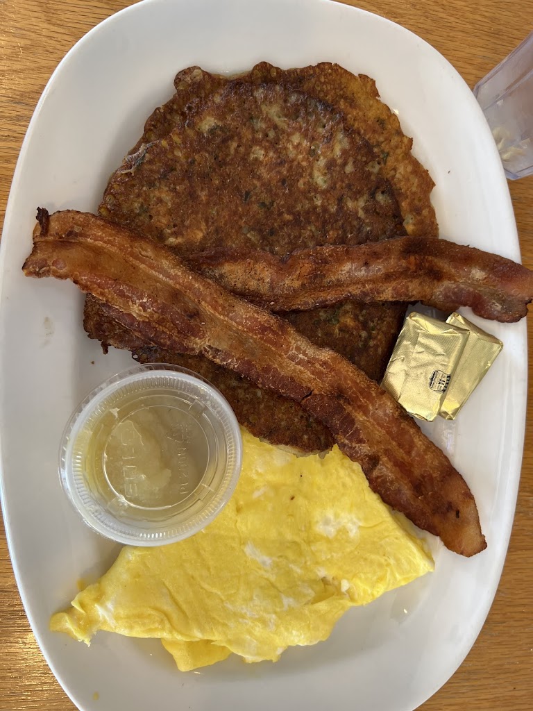 The server was good. The kitchen was fast and the atmosphere was nice. But man. The core concept of a restaurant is food. And the food here just wasn’t good. I had scrambled eggs bacon and pancakes with a side of hash browns and toast.