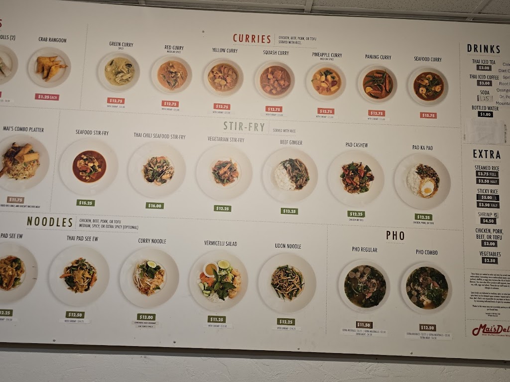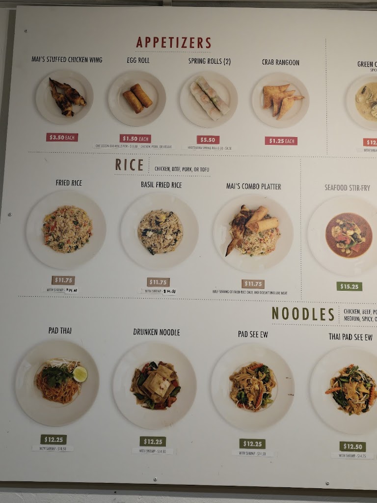 I have been dining at Mai's for years and it has been consistently stellar. Great menu, with a good array of curries and other dishes. You can get an authentic level of heat, if desired. They use plenty of herbs such as Thai basil, often not the case in American Thai restaurants. It is nice that at they offer vegetarian options like squash curry and tofu, as well. Atmosphere is simple with a spartan dining area, but it's all about the food and great service!
