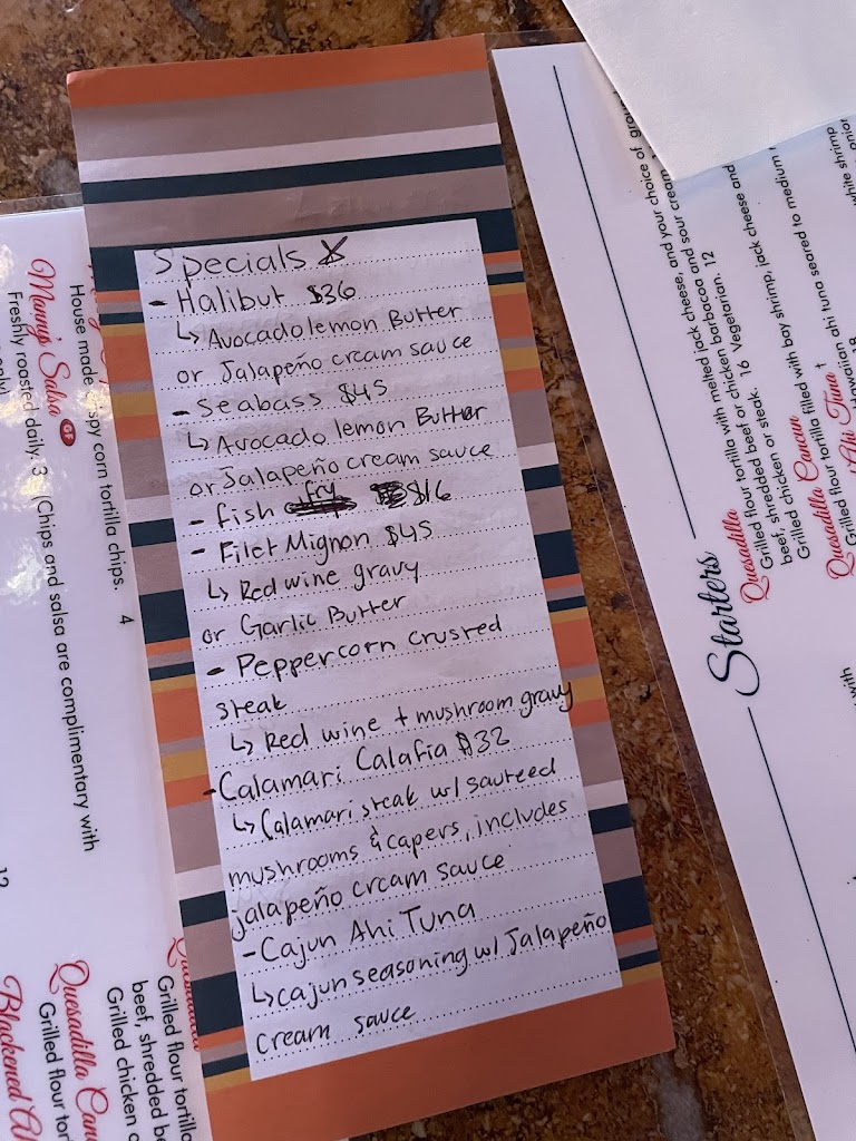 Cons: too many up-charges. We ordered the quesadilla, which at any other restaurant would include a complementary salsa. We were told that if we wanted salsa, “it would be $2. No wait, $3.” We told her that is ridiculous and to please pass it along to her manager. She said she just works there. I reiterated again, please pass it along to your manager.