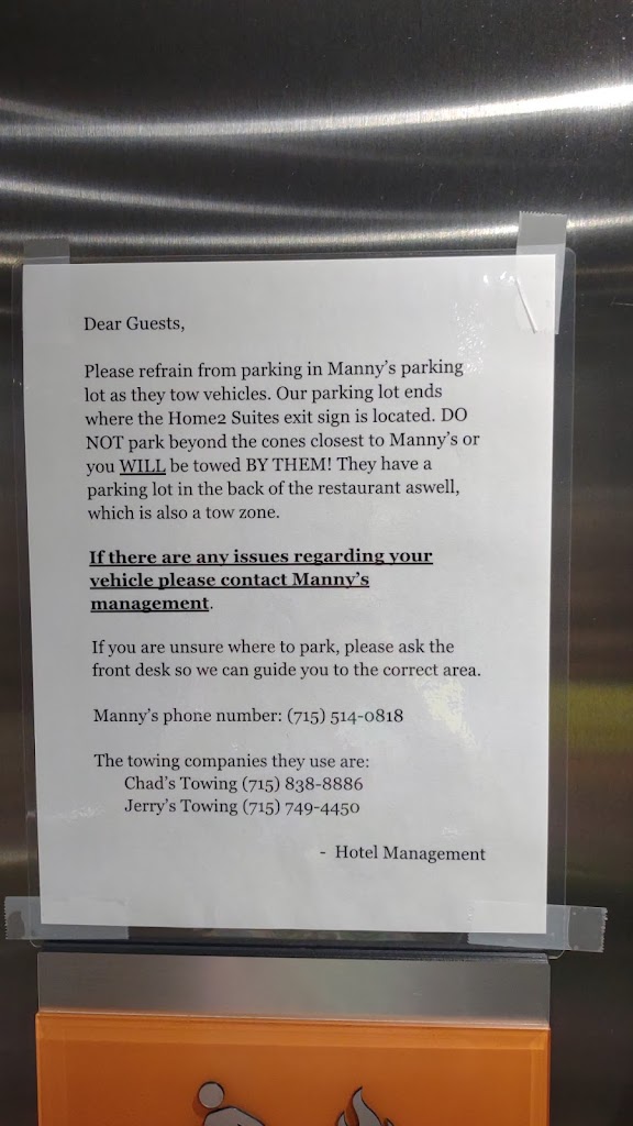 If I could give a zero rating, I would. I arrived at Home2 Suites at 12:00am after an arduous day of travel. I parked next to this large white truck in front of the hotel. The parking spot was not marked as exclusively for Manny's patrons. However, when I checked in, the hotel gave clear instructions to not park here because Manny's will tow my vehicle. This is a shared lot with the hotel. There is NO SIGNAGE indicating the spots are for the restaurant. The hotel added this advisory sign in their elevator. Congratulations Manny's. If you wanted to turn people away, you succeeded. I come to Eau Claire regularly and will NEVER patronize your restaurant, and I will discourage others as well. Mark your spots if you are that covetous over two parking spots far from your entrance.