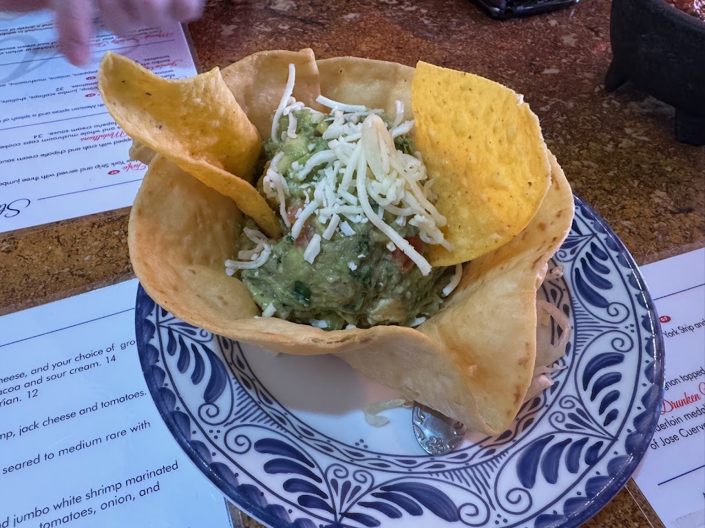 We always seem to eat here, outside of the normal lunch/dinner rush. When we arrived Sunday mid afternoon, there were only several others tables of customers. Got greeted and seated right away. Our server was super friendly, and got us settled in with menus and waters. We immediately ordered some guacamole, which is fresh and chunky, with excellent chips.