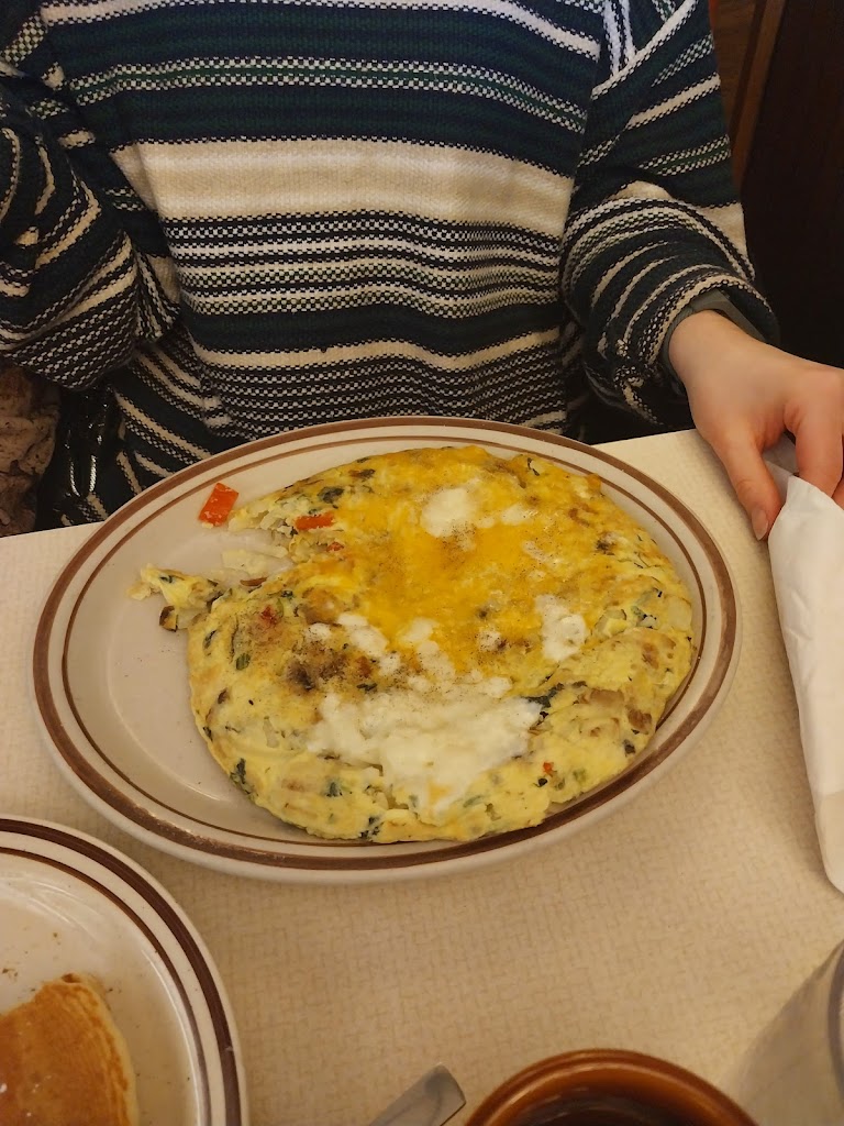 The omlette was HUGE and well worth the price. I couldn't even eat it all it was a lot of food. And tasted wonderful. Pancakes were slightly dry so make sure you order a sauce etc or use that syrup.