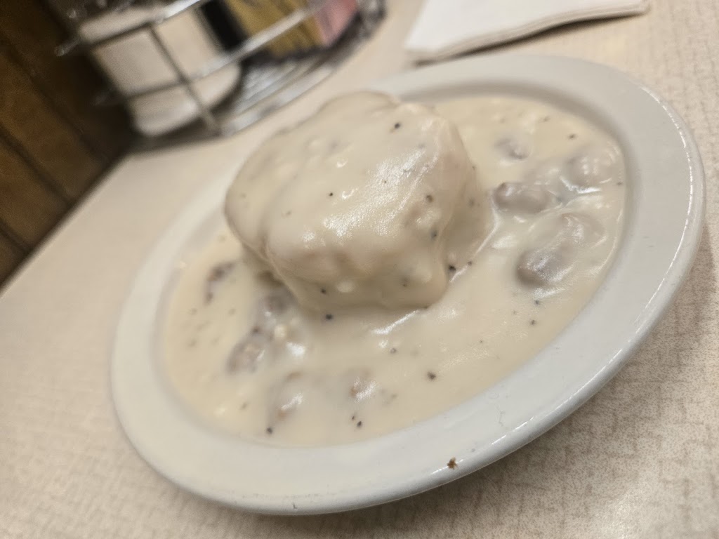 It is nice to come in to a smiling staff. Waitress was fantastic. Had biscuits and gravy with eggs. It was good 😊