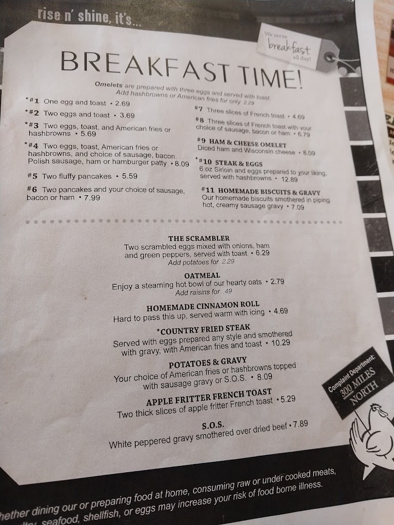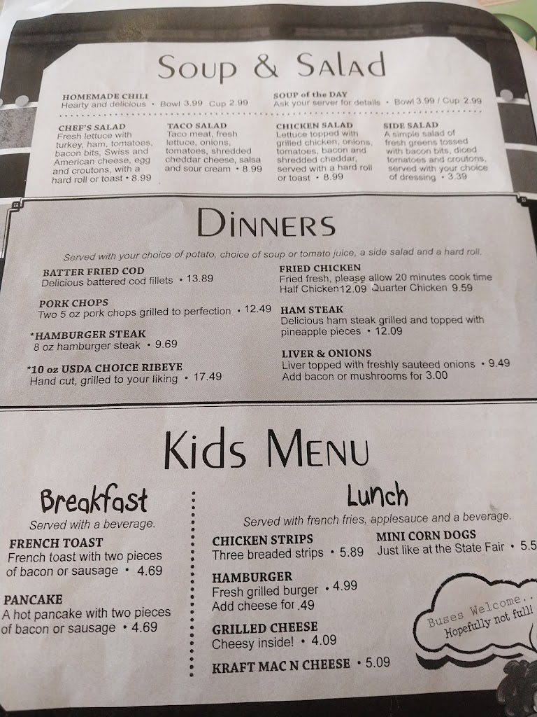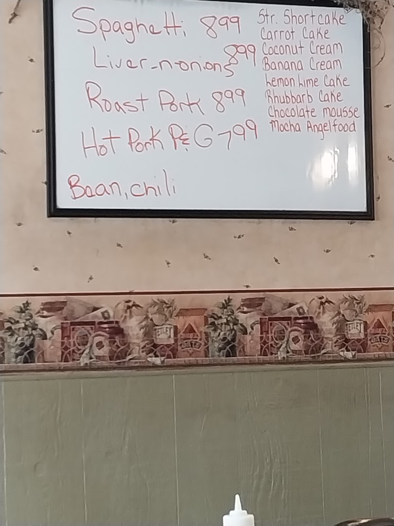 The food was delicious! Breakfast was the best this side of Wisconsin! Prices are unbelievably great too. The Restaurant was like a welcome come on in feel and felt like moms food. Very pleasant server. She was the only server when we arrived and she had a house full of guest served everyone with a smile. Highly recommended.