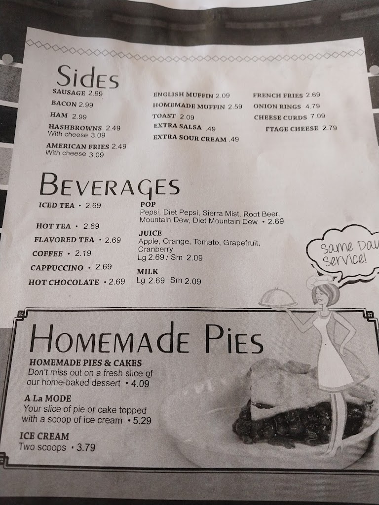 Waitress was hilarious! The portions of food were huge. Great prices. Sweet treats at front counter too. Highly recommend. Nothing super fancy. Smaller establishment. Plan on waiting a little bit for food. I mean it takes time to cook all the food that will show up on your plate.