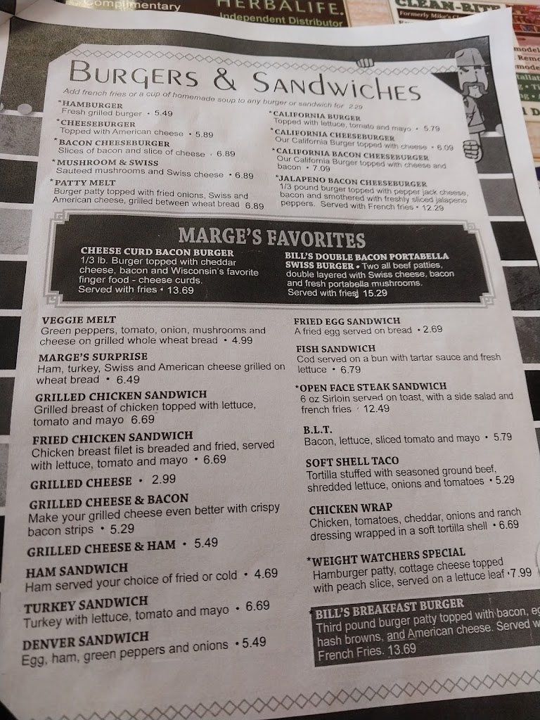 Excellent home cooked omelette, hash browns, cheeseburger soup and cheese sandwich. We had lunch with a tip for $20.00. I highly recommend Marge’s.