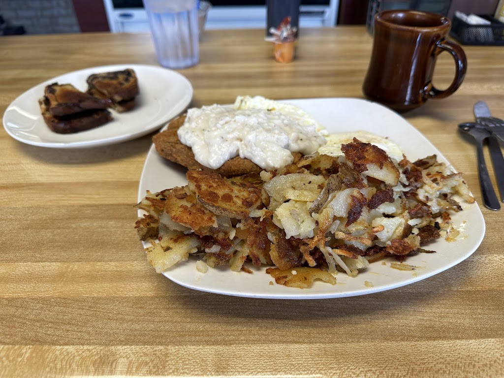 Stopped in for a late lunch and had breakfast. Got enough food for two meals. Very tasty also. Fun servers. Definitely will stop again. Recommend anything on the menu!!