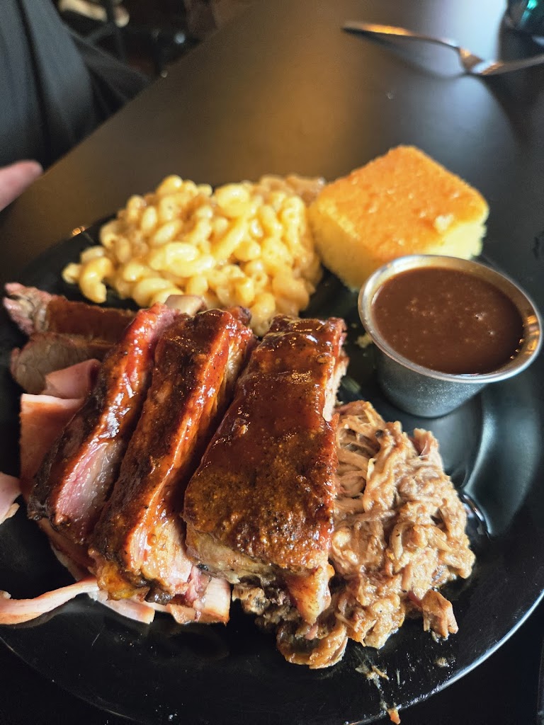 I tried the 3 meat sampler with cornbread and man n cheese Great food ill be back!