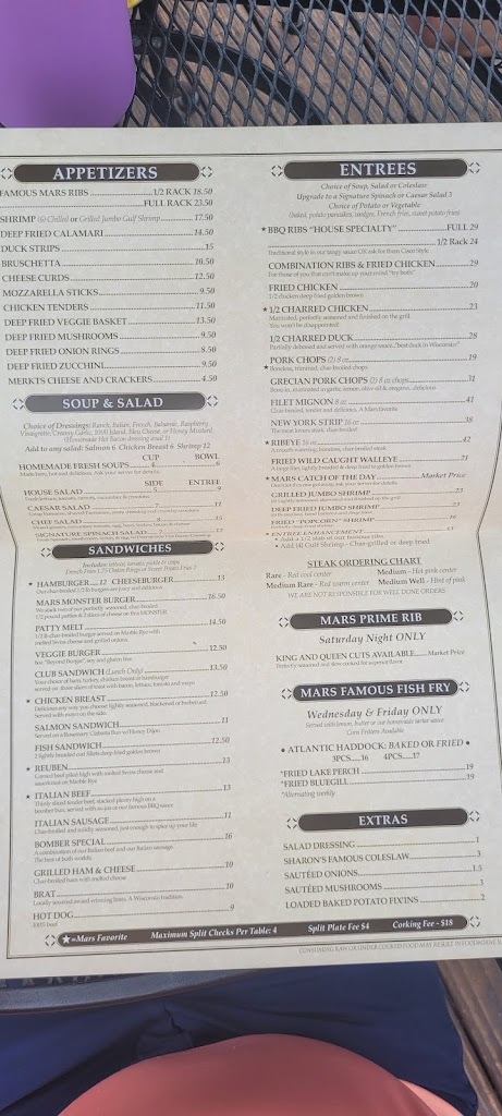 We went there two weeks ago tomorrow for the famous Mars fish fry. We knew the place would be busy, but it seemed like vehicles were parked almost a half a mile away. We noted there were many people waiting so we disappointedly left, but I heard so many good things about Mars that we had to go back so Labor Day, we decided to try it for lunch. We were greeted by a very friendly, smiling hostess, and we were elated because we were seated immediately when I saw that they had walleye and potato pancakes on the menu. I was eager to try it because those are two things that I love. My wife Mary started with a bowl of mushroom soup and I tried it. It was terrific. When we got our entrées, I was astounded at the size of the fish. It looked fantastic with a perfect breading and cooked with perfection. By comparison, we went to a restaurant which is supposedly one of the best in Lake Geneva, but the fish was nowhere near the quality served at Mars on top of the great food our server Ashley was just so friendly and always smiling with great service. When she suggested the strawberry whipped cream cake for dessert, although we were full, we shared one after we finished. I thanked Ashley for suggesting the cake and I told her it was so appropriate because it was my birthday. And so she immediately told me oh why didn’t you tell me I am going to camp that for you. I thought it was such a lovely gesture. We are definitely going to make it a point to make the drive some Friday night to do their famous fish fry as a matter of fact when I posted a picture of my lunch, I have other families members that are going to make the drive up as well thank you so much Mars for the great experience..