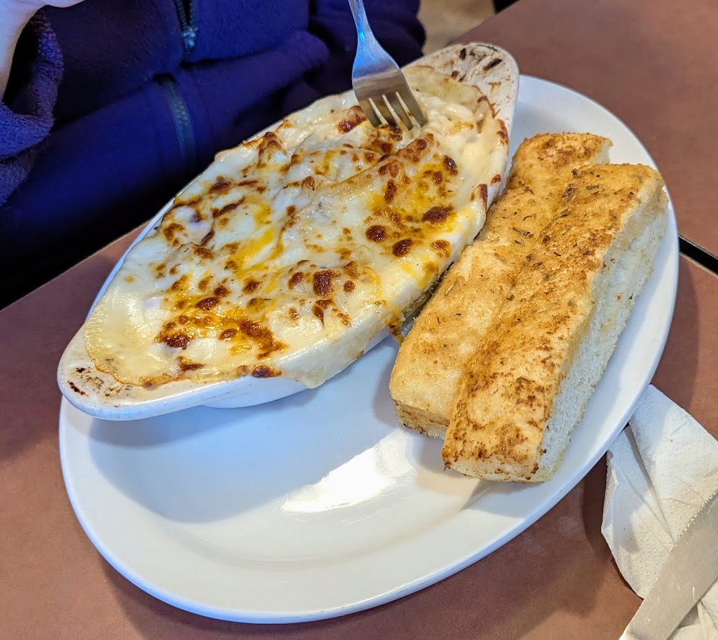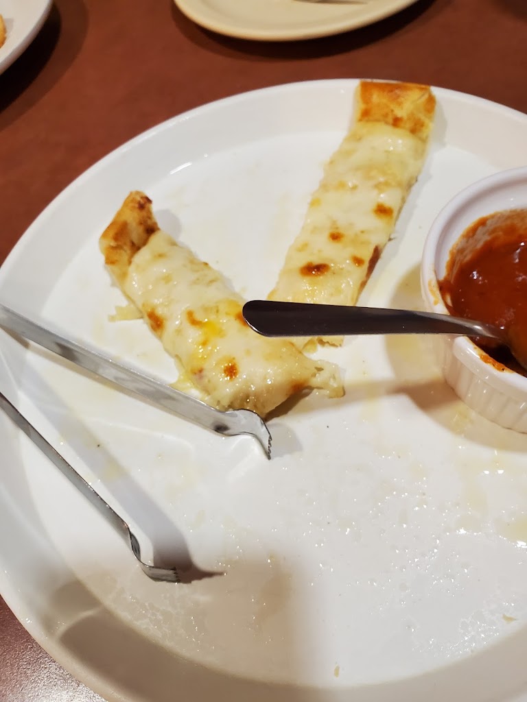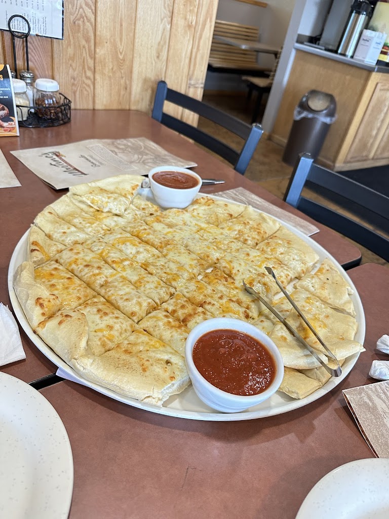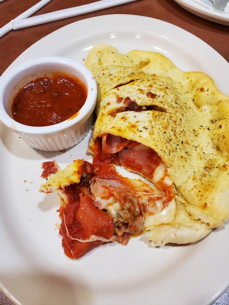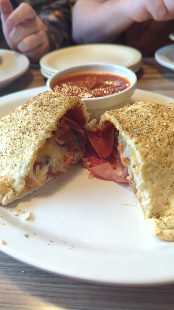 My husband and I stopped here on our way home from UW-Stout visiting our grandson March 11. Good location along the highway. A large menu. We had salad bar which was fresh with many choices. Soup was included. I had a cup of both the broccoli cheese soup and the chicken dumpling. Excellent homemade soups! We had cheesy garlic bread which came with a tasty dipping sauce. Then our calzone arrived with more of that tasty sauce. We were very hungry when we went in, but could only eat half the calzone. Brought the rest home. Sorry there wasn't enough room for a dessert. They offer gelato and fruit streusels. Customer service was great. Hope to try their lunch buffet some time.