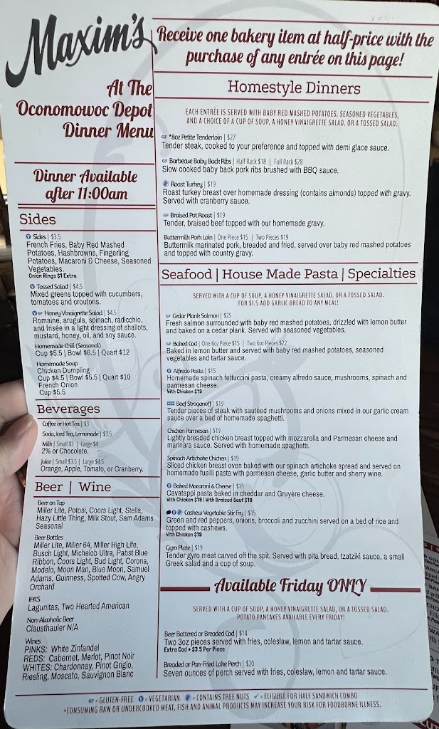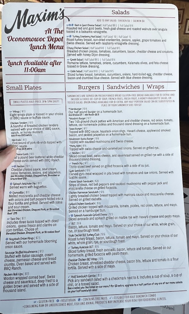 My wife and I recently visited Oconomowoc, we found Maxim's restaurant which was the old train depot for the town, the service, and food was delicious and presented well, lots of healthy choices, Maxim's is our official daily eaterie!!! Prices were very fair!!