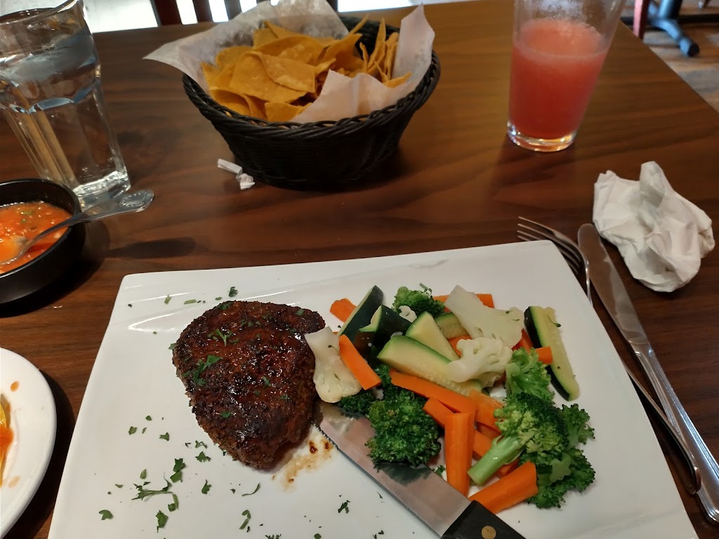 I had to 8 ounce filet mignon with steamed vegetables and one Margarita and the bill was $42.20......The filet was just way too spicy couldn't eat it and no flavor at all to the vegetables.