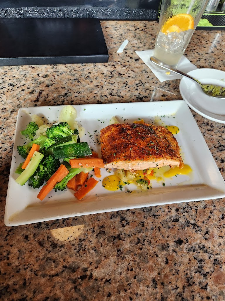 Atmosphere was cozy. Staff did an excellent job.food was awesome. For an appetizer i had the green muscles for the entree i had salmon stuffed with crab and for desserti had a slice of keylime pie. Definitely a great place all around. A must try, but definitely will visit again
