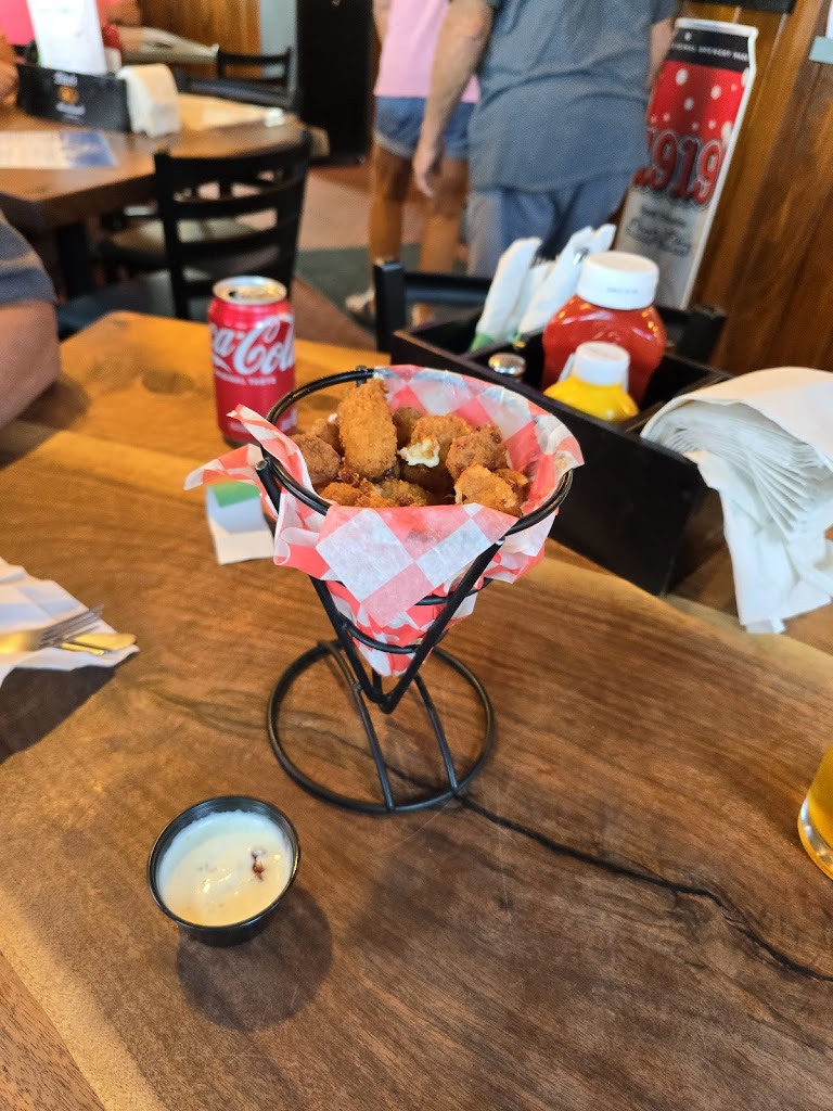 Great good, awesome atmosphere, and service was phenomenal. Good place to fish or swim for the kids while the adults have a beverage ;)